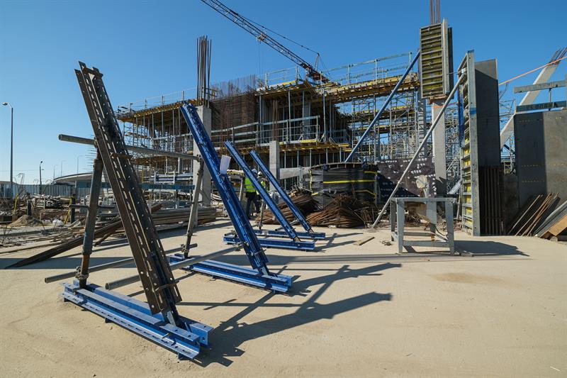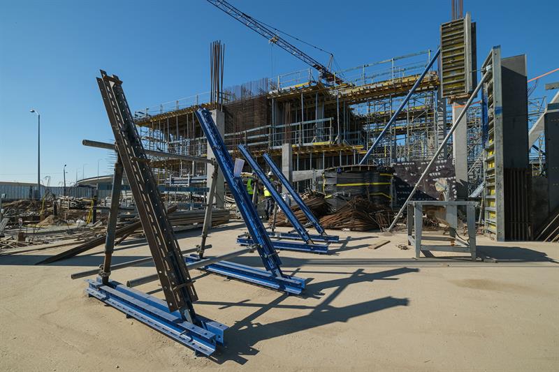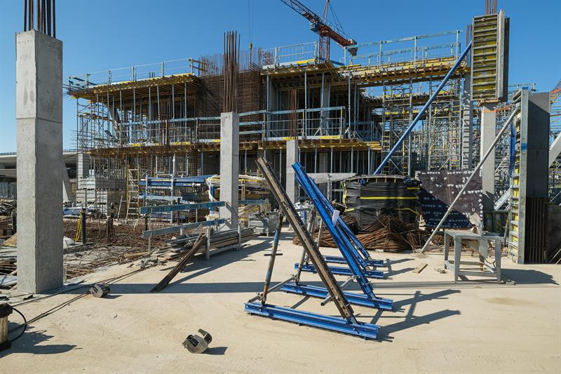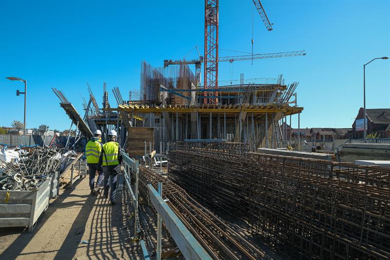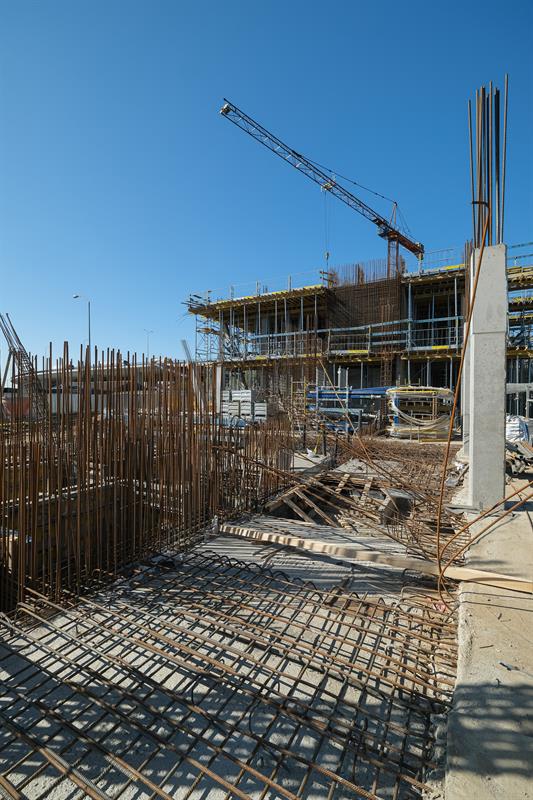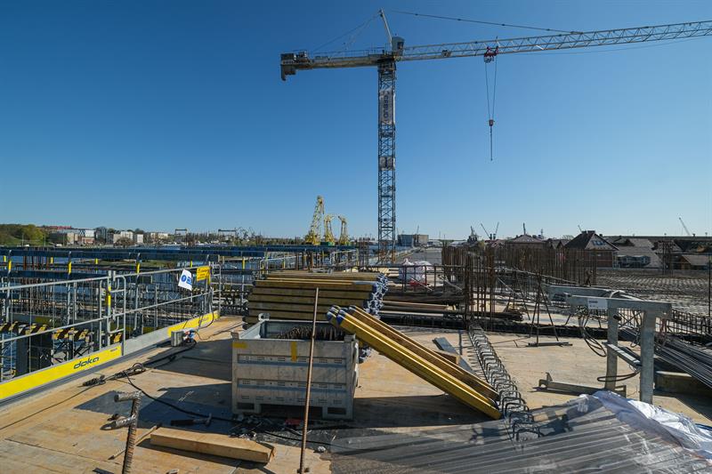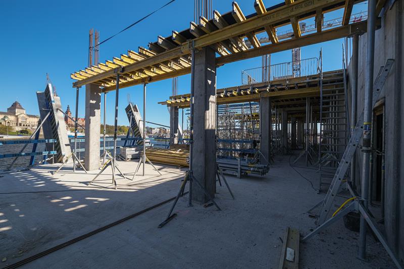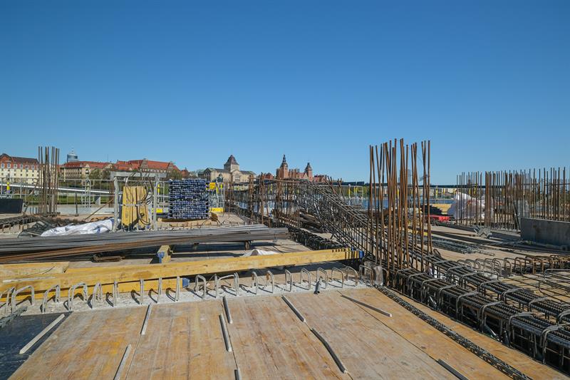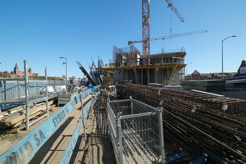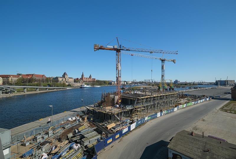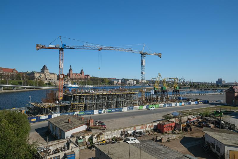 Wykonawca od kilku dni wykonuje prace związane z montażem szalunków słupów skośnych, które wymagają dostępu do placu budowy od strony nabrzeża. Przypomnijmy, że spółka ERBUD ograniczyła do 50 liczbę pracowników zaangażowanych przy inwestycji.