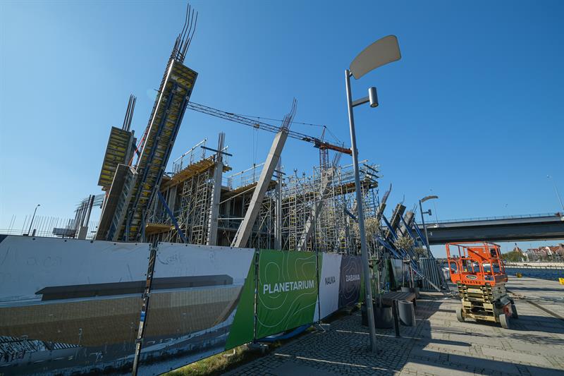 - Erbud wykonuje stropy żelbetowe piwnicy, parteru i pierwszego piętra w różnych sekcjach budynku. Wykonano szalunek konstrukcji planetarium i wylano betonem podłogę - informuje Jarosław Dobrzyński, rzecznik prasowy MCN. - Na odgrodzonej części promenady wzdłuż nabrzeża między estakadą Trasy Zamkowej a dźwigozaurami umieszczono podpory szalunków do wylania słupów ścian zewnętrznych. Będą one pochylone tak, aby zgodnie z zamysłem architekta przypominały kadłub statku zacumowanego na Łasztowni.