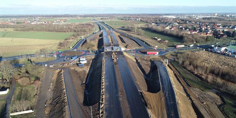 Zaawansowanie prac na budowie odcinka drogi ekspresowej S11 Koszalin – Zegrze Pomorskie wynosi już 85 procent. Na trasie powstają dwa węzły drogowe, para Miejsc Obsługi Podróżnych (MOP), a najdłuższym obiektem inżynierskim jest most przez rzekę Radew. Planowany termin zakończenia inwestycji szczecińskiego oddziału Generalnej Dyrekcji Dróg Krajowych i Autostrad to trzeci kwartał tego roku. Na zdjęciu: węzeł Koszalin Zachód.