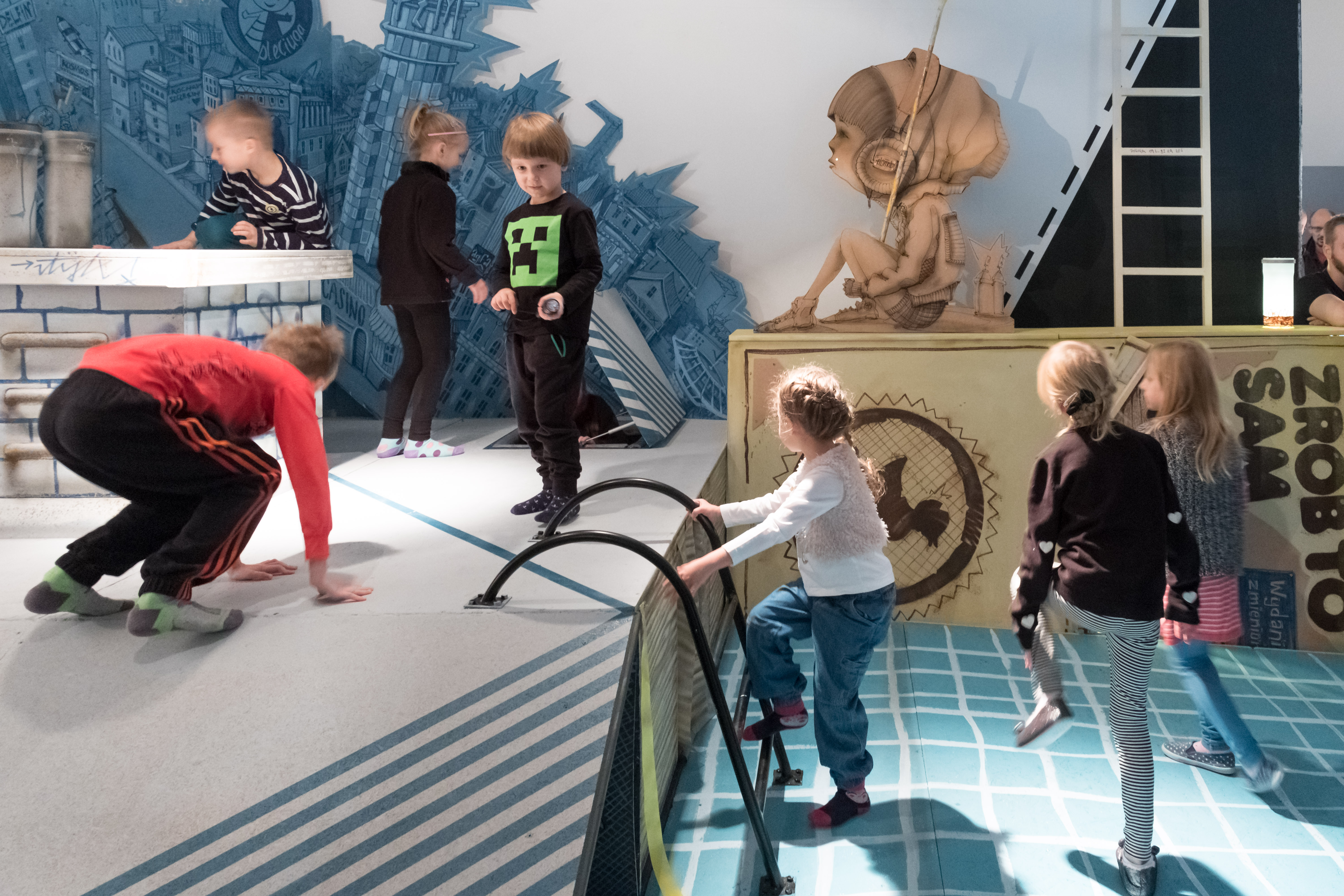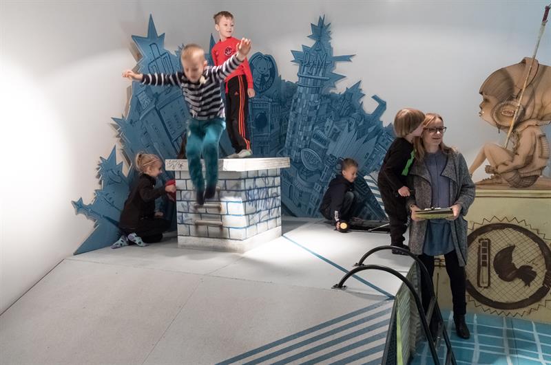 Mnóstwo osób odwiedziło szczecińską galerię "Tworzę się" podczas niedzielnego otwarcia nowej wystawy pn. Malowany Plac Zabaw. Tym razem na dzieci czekały ogromne książki przestrzenne, po których można chodzić i się wspinać. Ot, choćby na okładkę w formie dachu kamienicy, z której widać różne miejsca w Szczecinie. Maluchy miały ogromną frajdę zjeżdżając z niego na pupach, wchodząc do włazu, komina albo mieszkania na poddaszu. W galerii można też oglądać książki przestrzenne zrobione przez uczestników warsztatów.