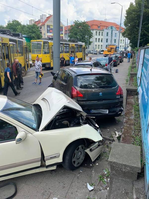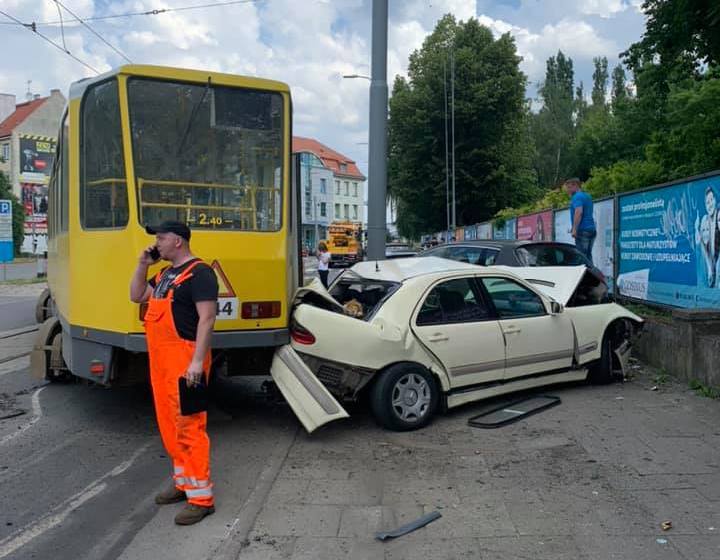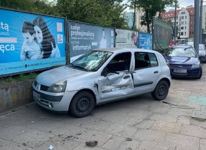 Na ulicy Firlika w Szczecinie wykoleił się tramwaj. Uderzył w dwa zaparkowane samochody. Jak widać - z dużym impetem.