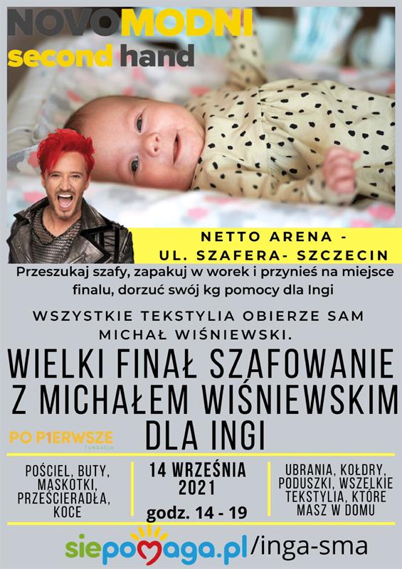 Trwa akcja „Szafowanie dla Ingi”. Włączyć się do niej może każdy, kto ma w swojej szafie rzeczy (ubrania, pościel, obrusy, buty, koce, torebki, firany i inne tekstylia), których już nie używa, i zechce je przekazać na pomoc dziewczynce. Dwunastomiesięczna Inga Niedźwiecka z Przęsocina choruje na rdzeniowy zanik mięśni (SMA1) i potrzebuje bardzo drogiej terapii genowej. Finał akcji już 14 września na parkingu Netto Arena w Szczecinie. Zebrane rzeczy odbierze Michał Wiśniewski, lider zespołu Ich Troje.