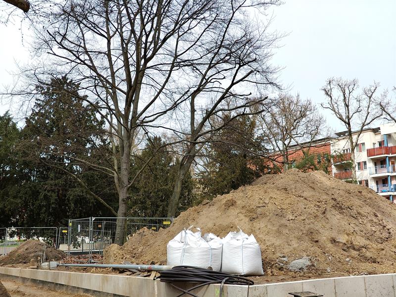Część z zabytkowych platanów jest zabezpieczona przed negatywnym wpływem w ich bliskości prowadzonej budowy. Jednak są też takie – jak widać na zdjęciu – przy których są składowane wielotonowe hałdy piasku. Nie tak powinien wyglądać „jakościowy skok w temacie opieki nad szczecińską zielenią” – o którym przekonuje Centrum Informacji Miasta. Na pewno nie taka być powinna praktyka „standardów utrzymania zieleni” w Szczecinie.