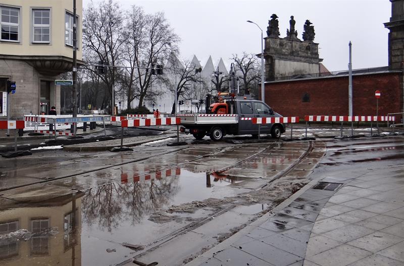 Jak się dowiedzieliśmy, cały zakres prac przy wymianie na nową infrastruktury w pasach torowisk i w obrębie wyłączonego odcinka nitki jezdni w ul. Jana Matejki [ta wzdłuż pl. Żołnierza Polskiego nie będzie przebudowywana - wyj. od red.], powinien być wykonany - według harmonogramu realizacji całego zadania - do końca maja tego roku. Ze względu na panujące warunki atmosferyczne w minionych dniach część prac nie mogła być prowadzona na już zamkniętym w styczniu fragmencie ul. Jana Matejki. Wykonawca zmuszony był wstrzymać prowadzenie zaplanowanych prac budowlanych branży drogowo – torowej, sanitarnej i elektro-energetycznej z uwagi na silne opady śniegu i niskie temperatury. Wraz z odwilżą drogowcy już jednak kontynuują m.in. rozbiórki. W czwartek zrywane były resztki pozostałych jeszcze starych podkładów na wysokości Bramy Królewskiej, tuż przed zakrętem i wjazdem na pl. Żołnierza Polskiego.