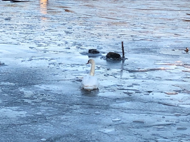 Dyżurny SM otrzymał alarmujący sygnał o łabędziu przymarzniętym do tafli Odry Zachodniej na wysokości ulicy Grobla. Strażnicy natychmiast udali się na miejsce, wcześniej o zdarzeniu została poinformowana straż pożarna. Na miejscu obie służby stwierdziły, że faktycznie na zamarzniętym akwenie siedzi piękny biały łabędź i się nie rusza. Na specjalnych saniach ratowniczych strażacy przybliżyli się do ptaka i uwolnili uwięzionego w okowach lodu. Łabędź po chwili odleciał.