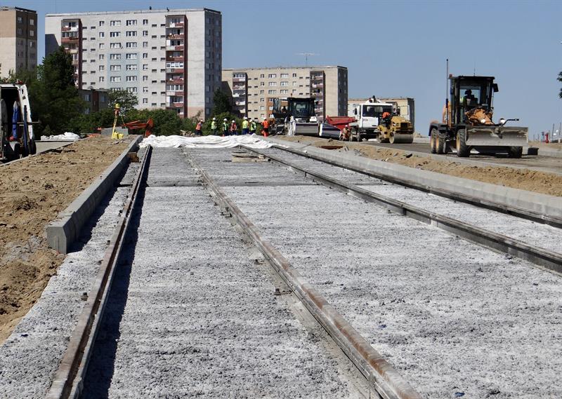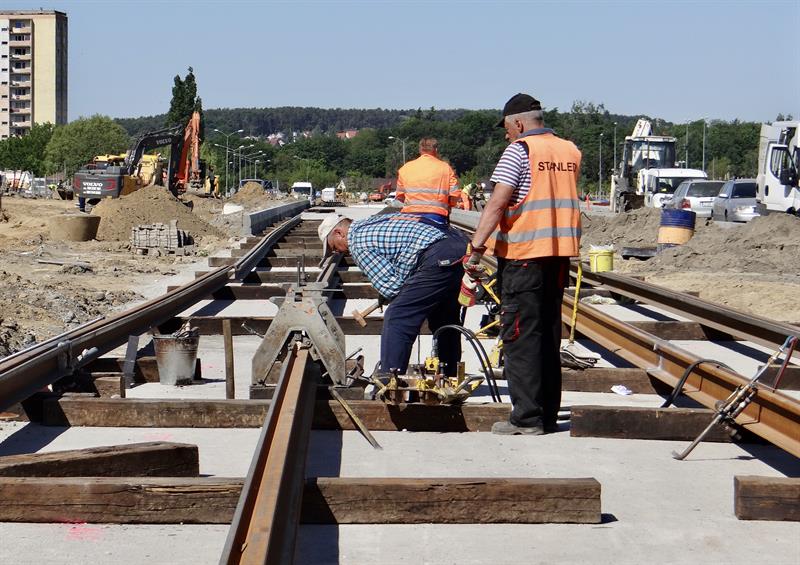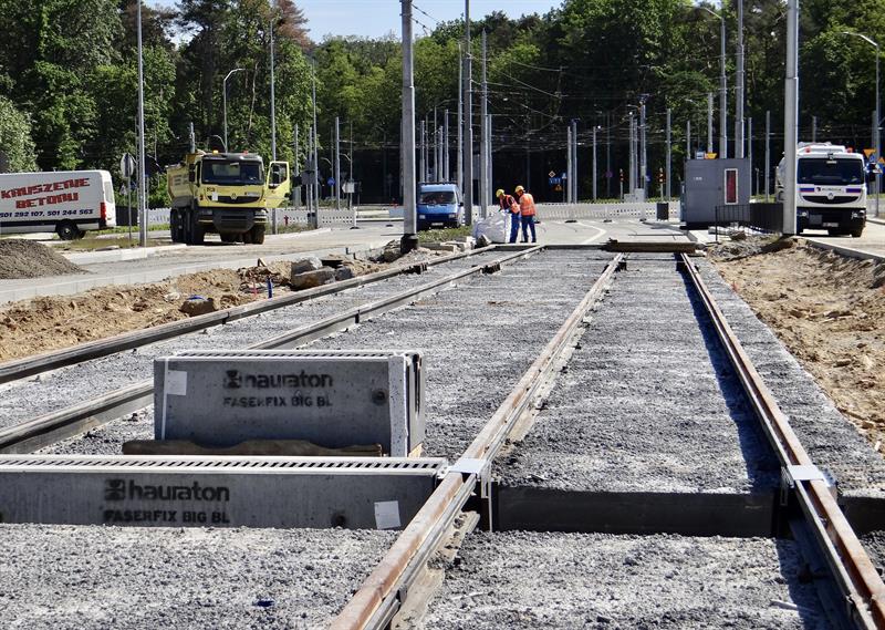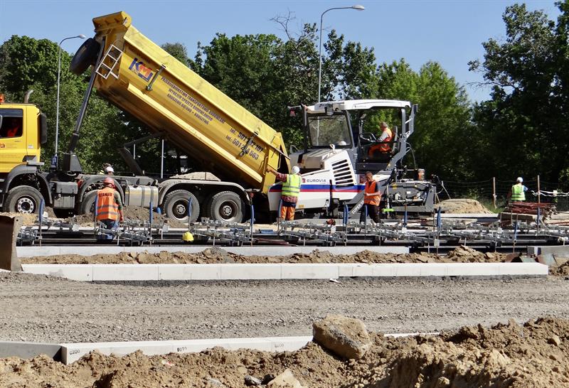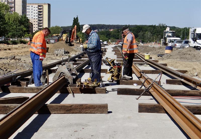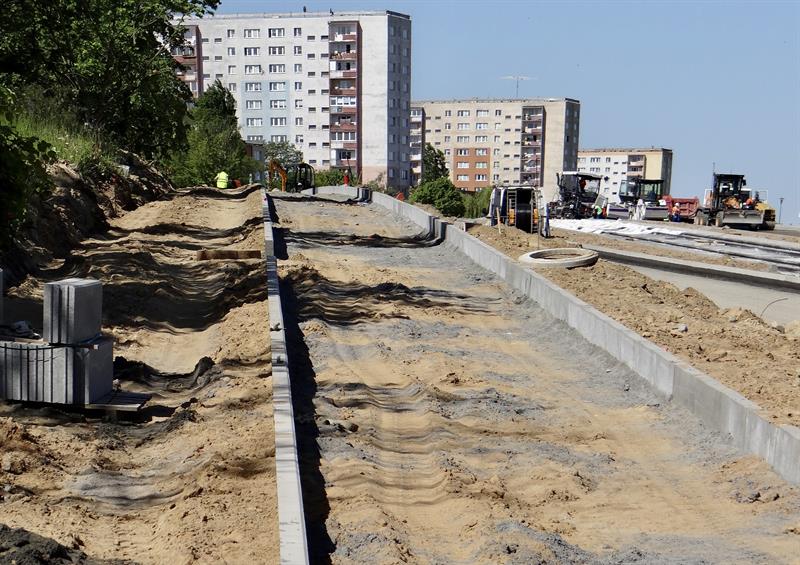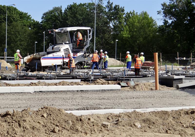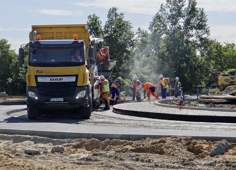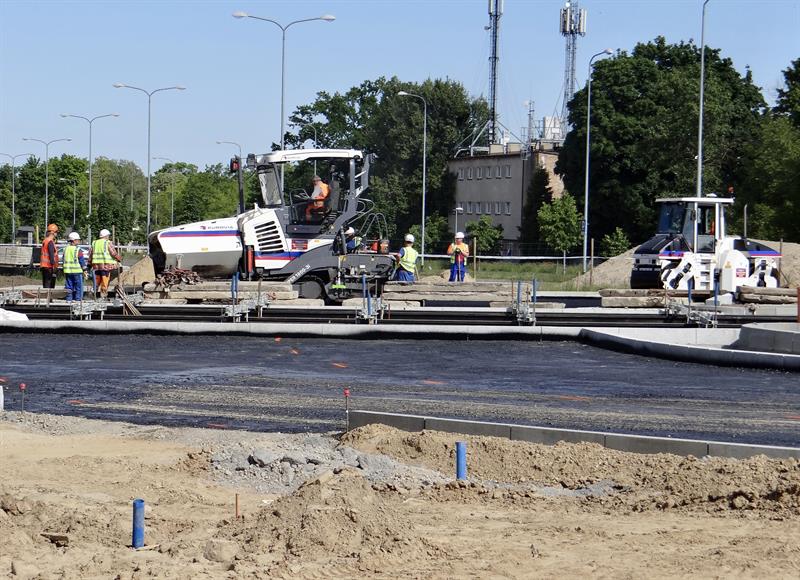 Od pierwszych dni czerwca na gotowej już podbudowie jezdni wokół nowego ronda Szczecińskich Olimpijczyków wylewana jest pierwsza warstwa asfaltu. Trwają tam jednocześnie prace brukarskie na samej wyspie, przez której środek ułożone zostały szyny, a następnie zespawane i szykowane teraz do zalewania pierwszą warstwą podbudowy z betonu. Z montażem torowiska drogowcy zbliżają się do skrzyżowania z ul. Franciszka Jarzyńskiego.
