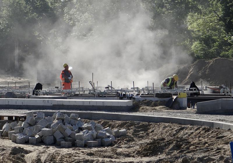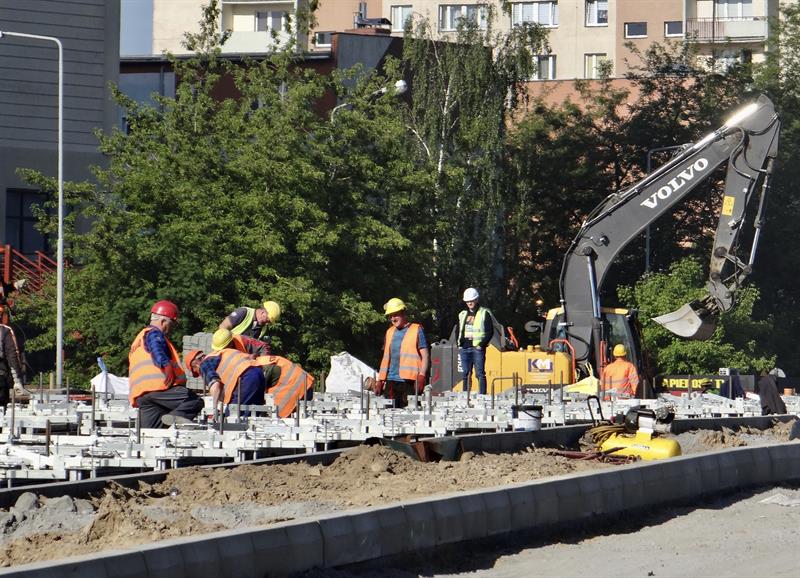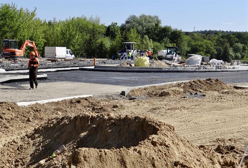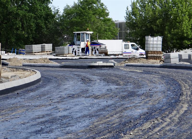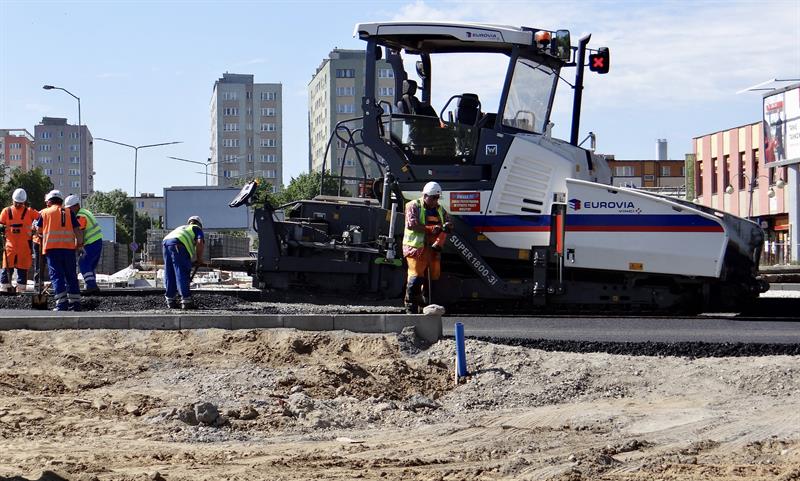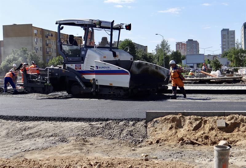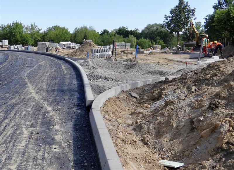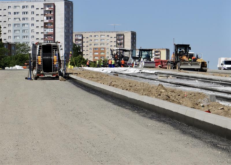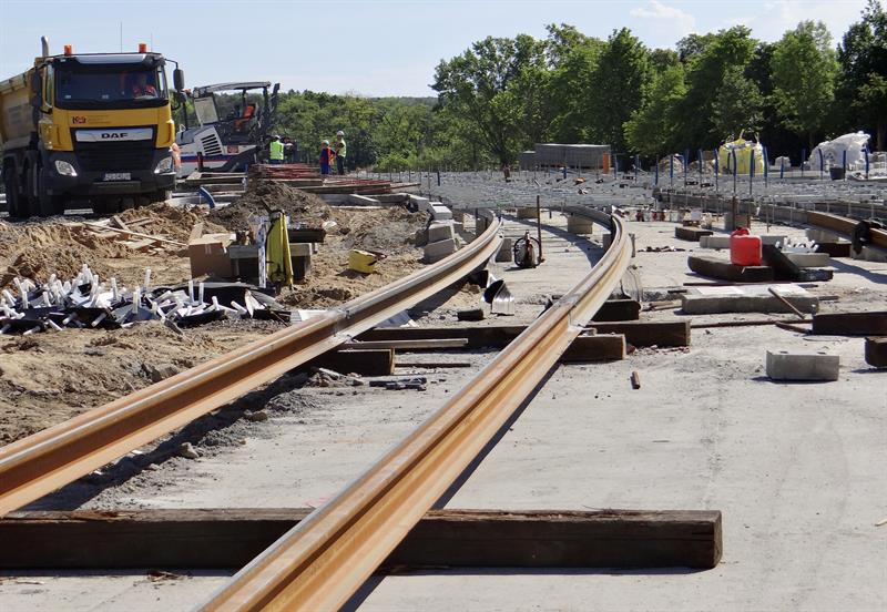 Od pierwszych dni czerwca na gotowej już podbudowie jezdni wokół nowego ronda Szczecińskich Olimpijczyków wylewana jest pierwsza warstwa asfaltu. Trwają tam jednocześnie prace brukarskie na samej wyspie, przez której środek ułożone zostały szyny, a następnie zespawane i szykowane teraz do zalewania pierwszą warstwą podbudowy z betonu. Z montażem torowiska drogowcy zbliżają się do skrzyżowania z ul. Franciszka Jarzyńskiego.