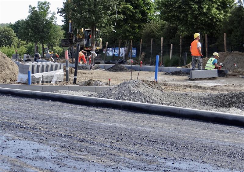 Na biegnącym po skarpie od strony kompleksu ogródków działkowych aż do wysokości myjni samochodowej pasie gruntu trwają równocześnie prace brukarskie przy urządzaniu od nowa chodnika. Tam też gotowy fragment torów osadzony został w pierwszej warstwie betonowej podbudowy.