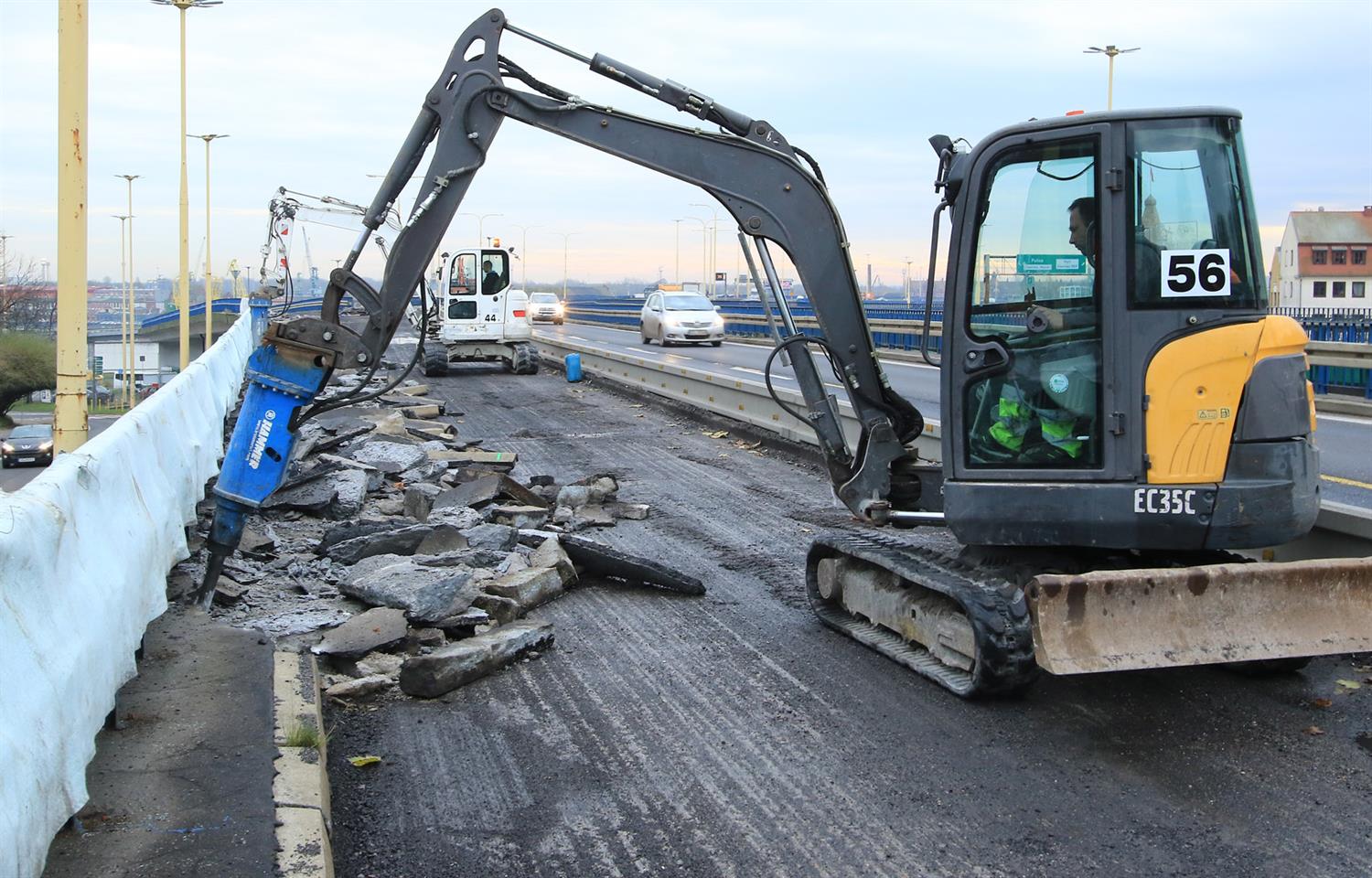 To już drugi miesiąc zaplanowanego niemal na rok remontu nitki wjazdowej Trasy Zamkowej do centrum Szczecina, którego finał ma nastąpić po przyszłorocznych wakacjach. Na zamkniętym dla ruchu samochodów prawym pasie jezdni i pasie ze ścieżką dla rowerów oraz pieszych trwają roboty przy kruszeniu, skuwaniu starej warstwy asfaltowej nawierzchni, demontażu barier oraz skuwaniu betonowej podbudowy jezdni.