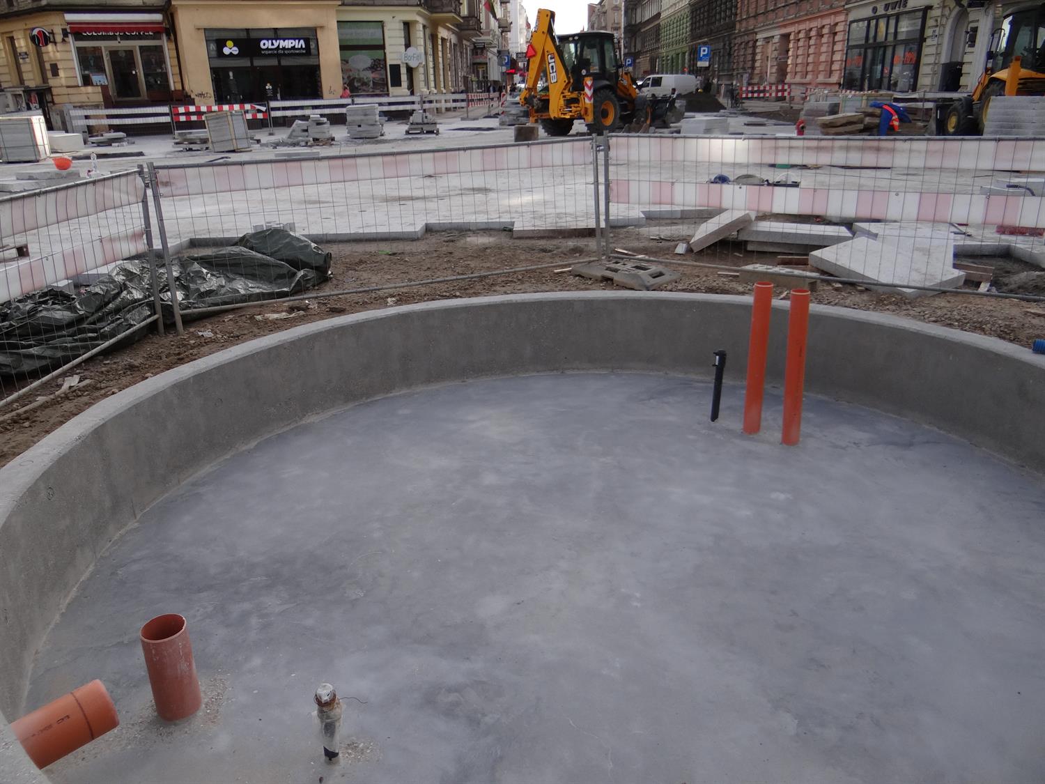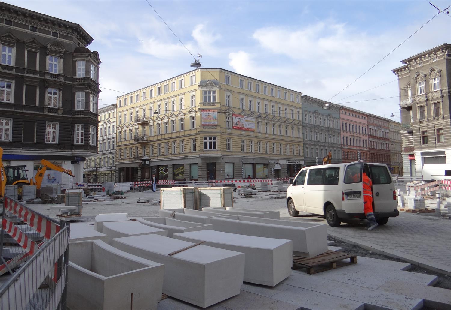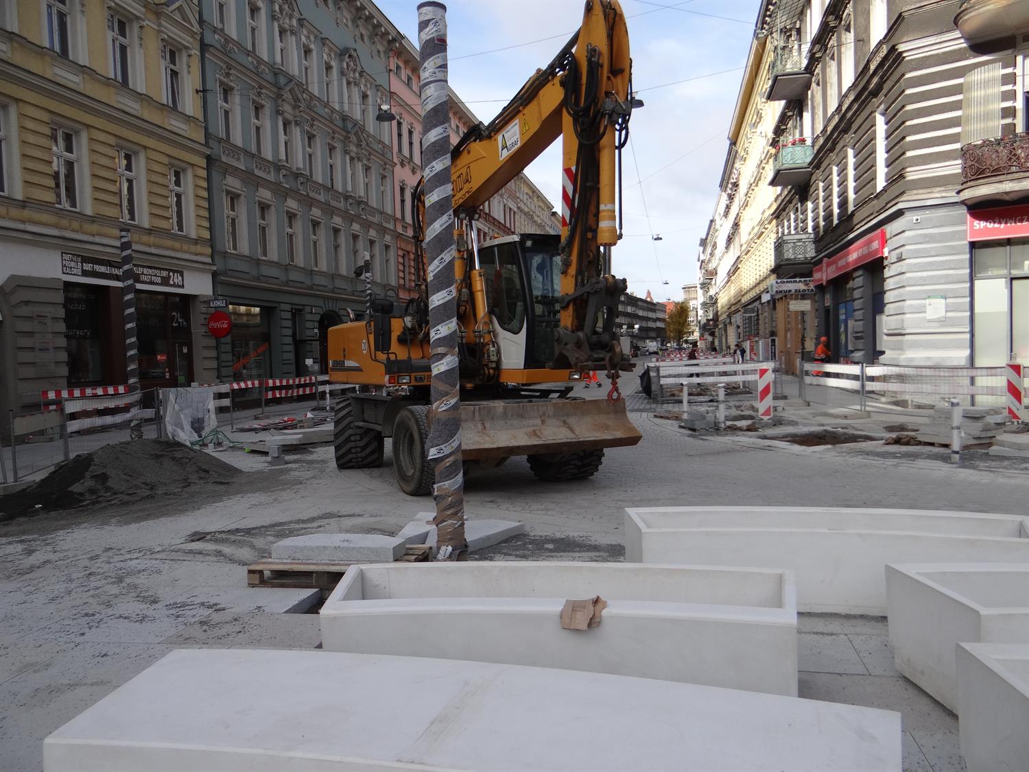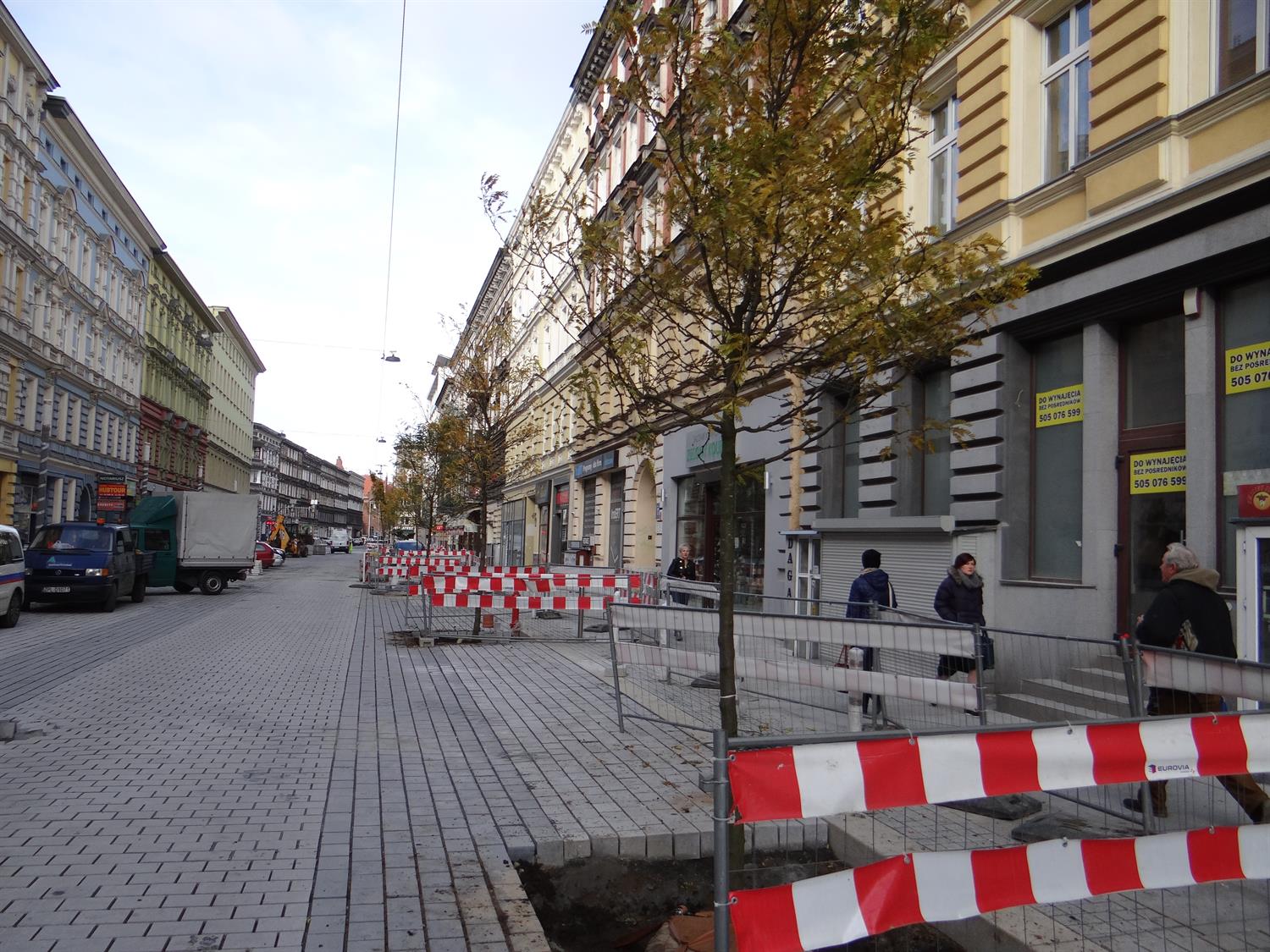 Sadzą drzewa, zwieźli siedziska i obrzeża donic, w których będą dodatkowo rosły krzewy iglaste, byliny, trawy i inne rośliny ozdobne. Gotowa jest betonowa niecka nowego wodotrysku, który czeka na montaż całej instalacji wraz z dyszami i LED-owych reflektorów. Zwężona jezdnia też prawie gotowa, ale w wielu miejscach jeszcze wymaga robot brukarskich, podobnie jak chodniki. Trwa też mocowanie słupków, barierek i stojaków na rowery. To - wedle zapowiedzi - ostatni już miesiąc przebudowy odcinka ul. Jagiellońskiej od al. Wojska Polskiego do pl. Ludwika Zamenhofa.