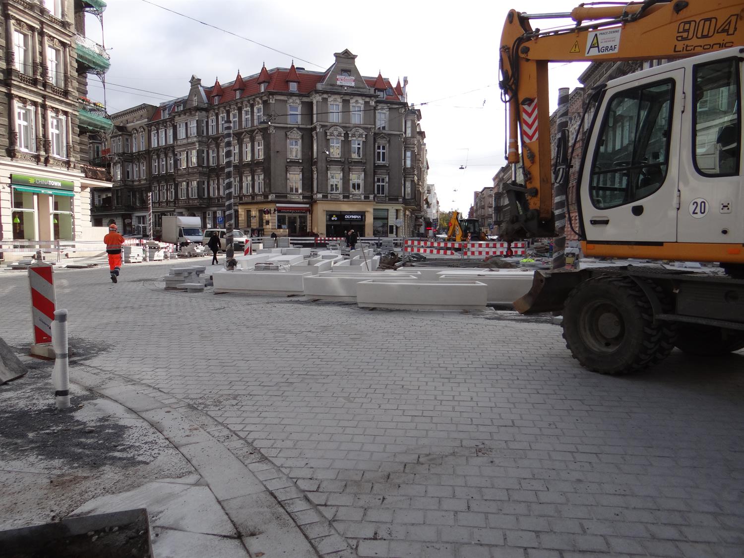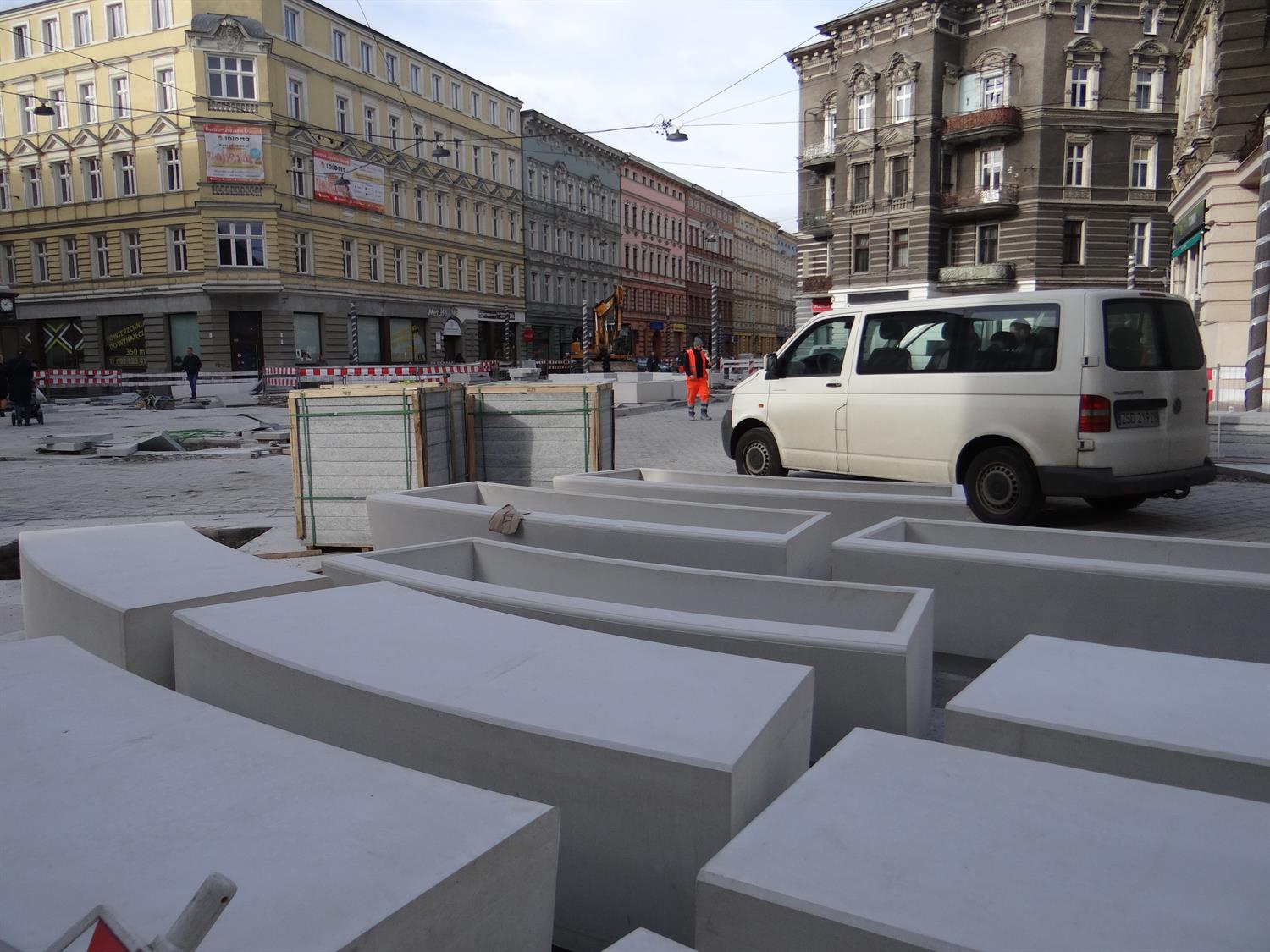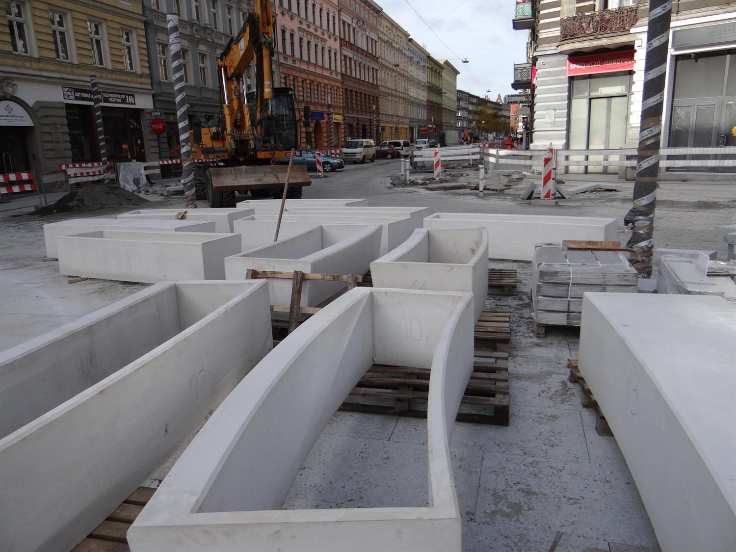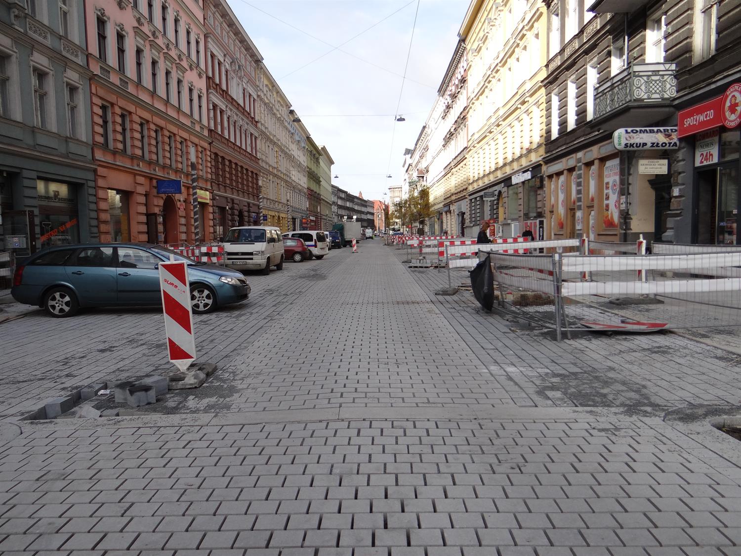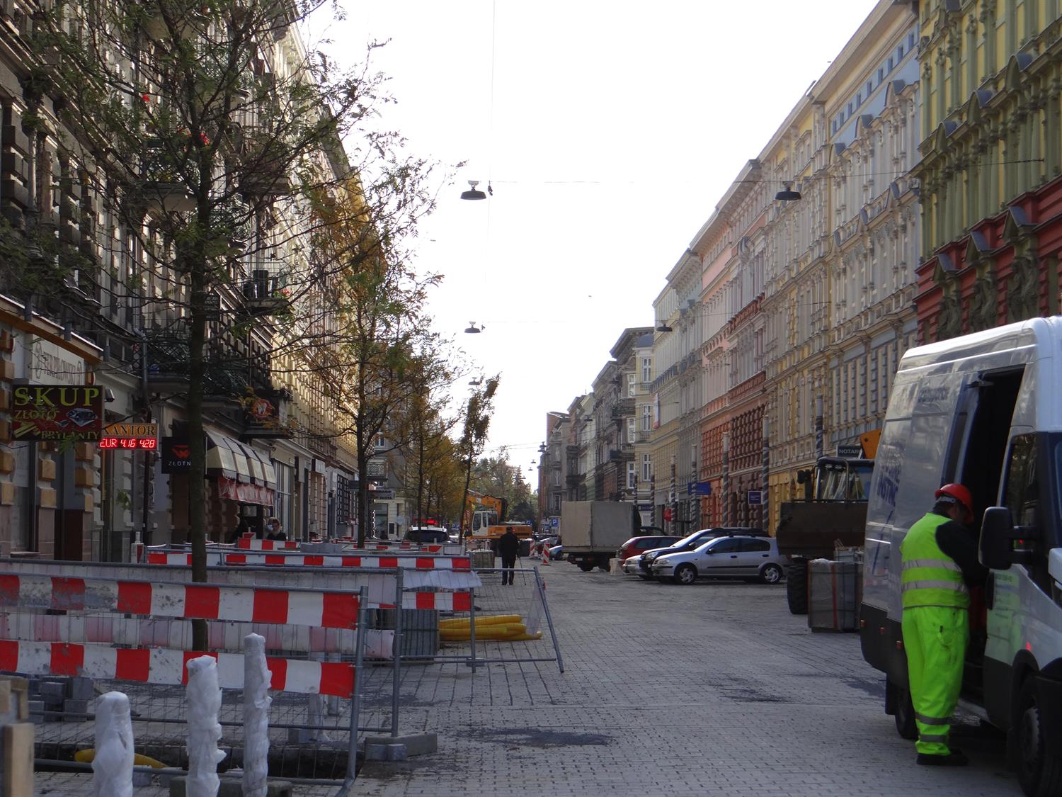 Sadzą drzewa, zwieźli siedziska i obrzeża donic, w których będą dodatkowo rosły krzewy iglaste, byliny, trawy i inne rośliny ozdobne. Gotowa jest betonowa niecka nowego wodotrysku, który czeka na montaż całej instalacji wraz z dyszami i LED-owych reflektorów. Zwężona jezdnia też prawie gotowa, ale w wielu miejscach jeszcze wymaga robot brukarskich, podobnie jak chodniki. Trwa też mocowanie słupków, barierek i stojaków na rowery. To - wedle zapowiedzi - ostatni już miesiąc przebudowy odcinka ul. Jagiellońskiej od al. Wojska Polskiego do pl. Ludwika Zamenhofa.