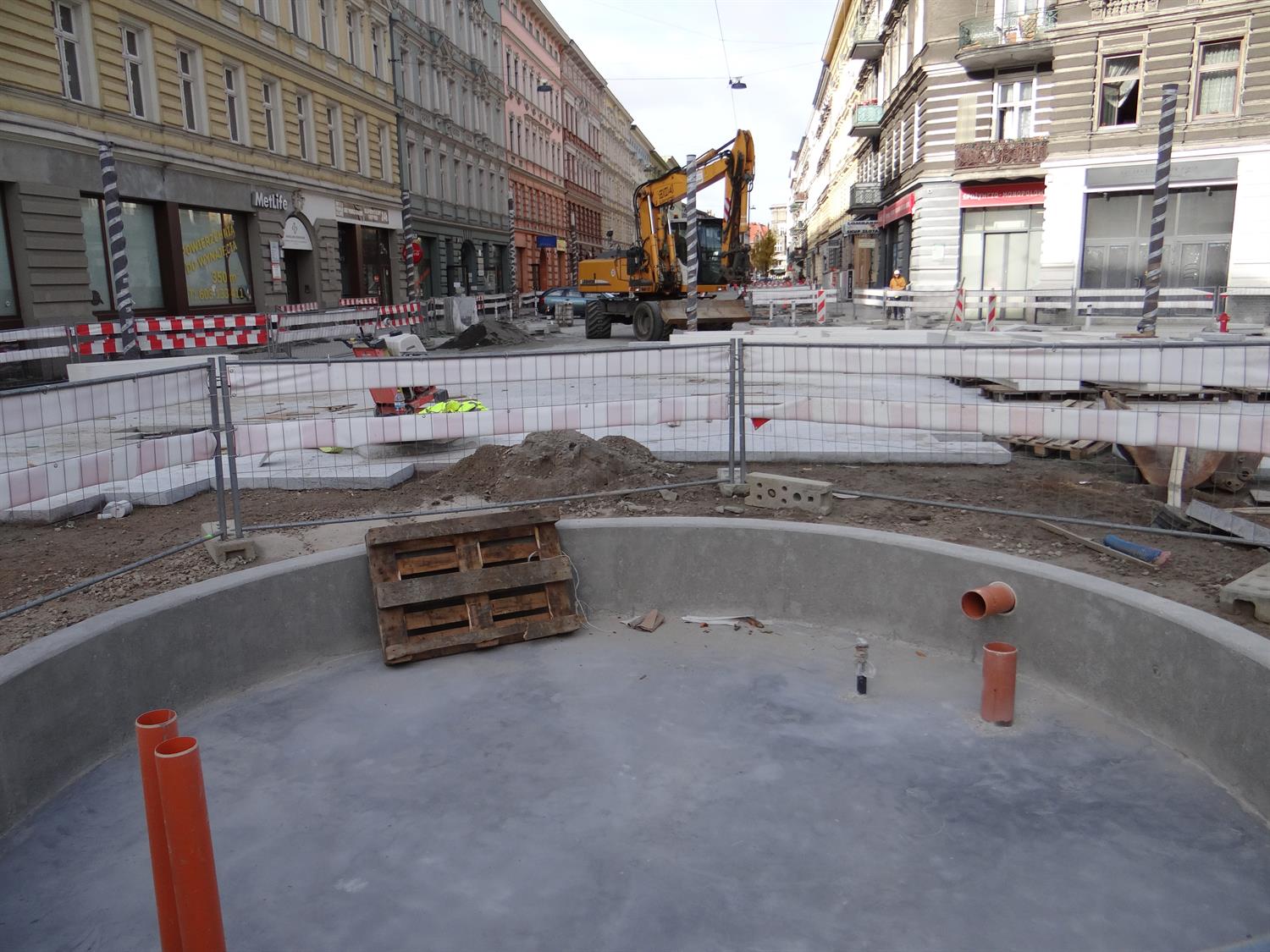 Na zdjęciu:Przebudowa ul. Jagiellońskiej w 44-dniowym poślizgu. Sadzą drzewa, zwieźli ławy i donice, niecka nowego wodotrysku gotowa.