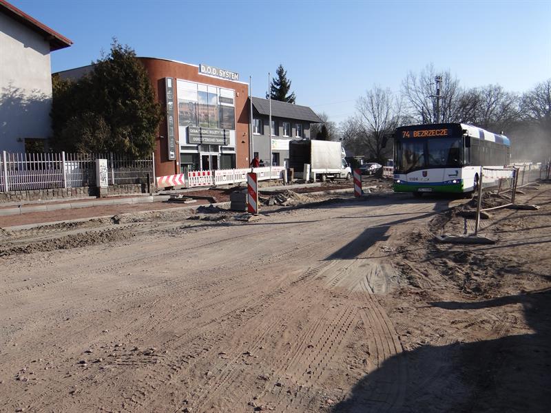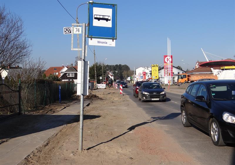 Na ul. Modrej, za nowym rondem przy jej skrzyżowaniu z ulicami Szeroką i Władysława Szafera, do połowy jezdnia w kierunku Bezrzecza jest wygrodzona i trwają tam wciąż prace przy nowej infrastrukturze podziemnej oraz wytyczaniu nowym śladem pasów pobocza z chodnikiem i miejscami parkingowymi. Na niewielkim fragmencie nawierzchnie zostały dotąd ułożone albo szykowana jest ich warstwa podbudowy. W innych rejonach aż do skrzyżowania z ul. Wronią samochody i autobusy komunikacji miejskiej pokonują ul. Modrą tylko jednym prowizorycznie wytyczonym pasem rozkopanej starej jezdni. Slalomem, raz jedną, raz drugą stroną, wytyczone zostały również tymczasowe wąskie pasy, po których mogą poruszać się teraz piesi.