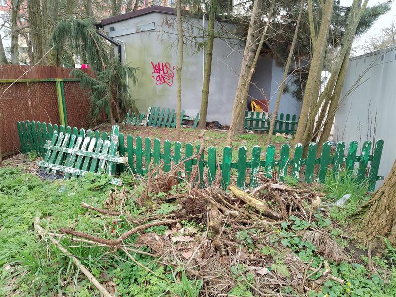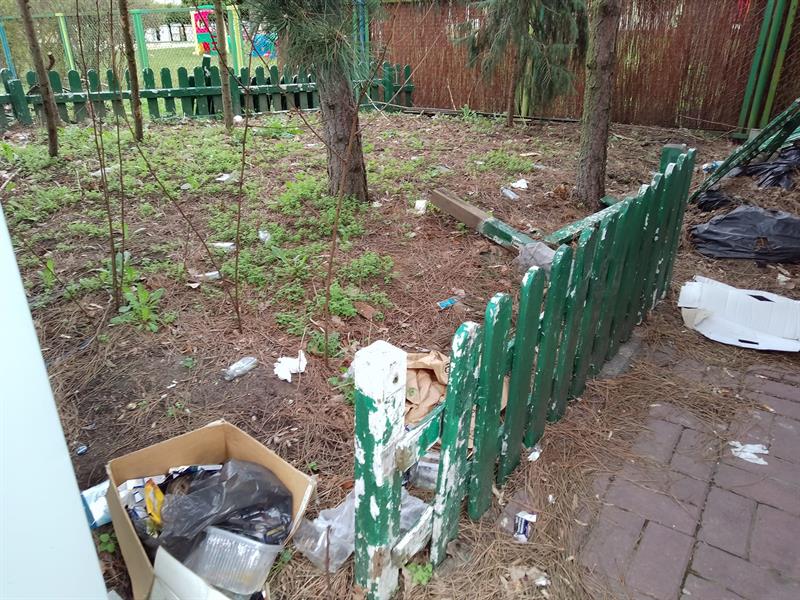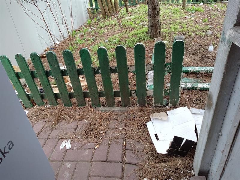 O ile paczkomaty widziane od strony ulicy nie sprawiają nieschludnego wrażenia, o tyle na ich zapleczu gromadzą się śmieci. Bałagan to osiedlowa klasyka – są więc puste butelki po różnych alkoholach, do tego kartony i jakieś foliowe worki, zapewne z kolejnymi śmieciami podrzucanymi przez kogoś, kto nie dotarł z nimi do śmietnika. Całość bałaganu, nie wiedzieć czemu, została ogrodzona drewnianym płotkiem.