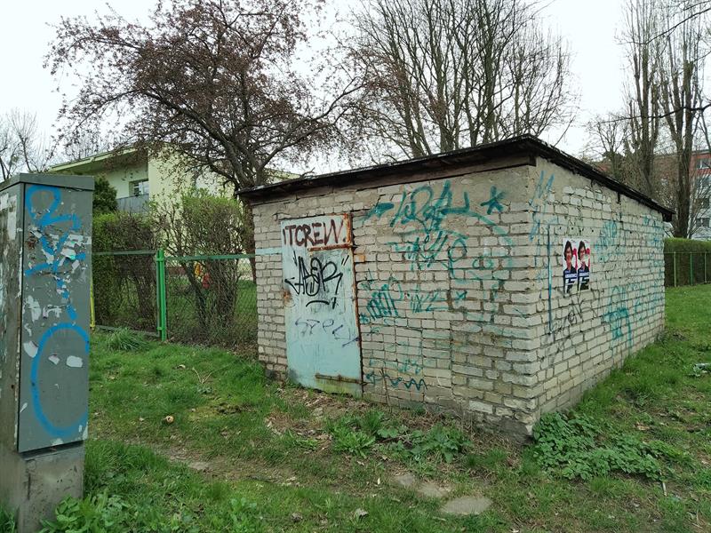 W odległości około 50 metrów od paczkomatów stroi od lat ceglana budowla, która być może była w przeszłości składzikiem np. na narzędzia lub piasek do posypywania. Obecnie budowla popada w ruinę. Jedyna z niej korzyść to swoisty słup ogłoszeniowy na plakaty wyborcze.
