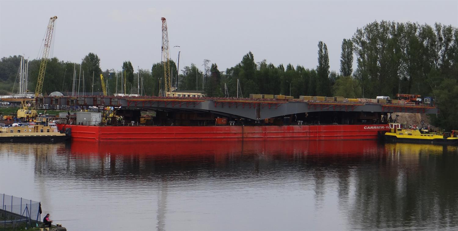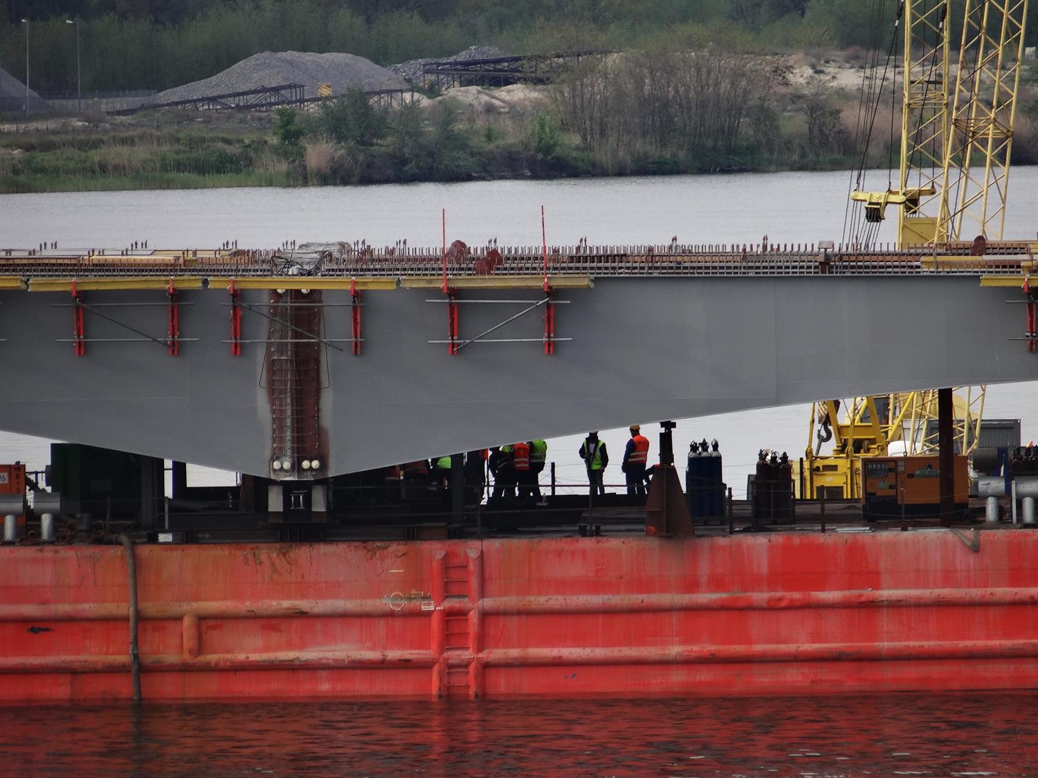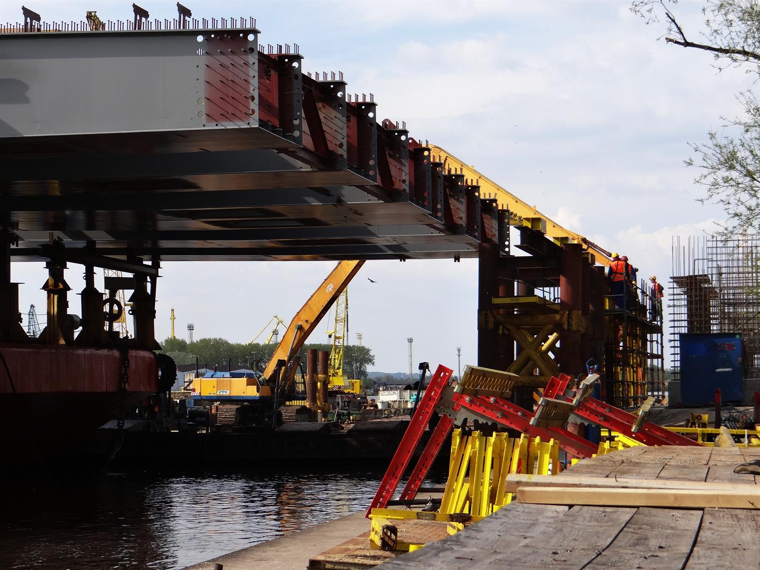 W jaki sposób zostanie przeprowadzone układanie przęseł mostu? – Postawimy ponton w poprzek, następnie zapniemy prętami za krawędzie mostu, za ślizgi, które są pod nim zaczepione i wciągniemy przęsło poprzecznie na przygotowane tory na filarze i na przygotowane tory technologiczne przy przyczółkach, które teraz są podbudowywane – tłumaczył M. Mróz.