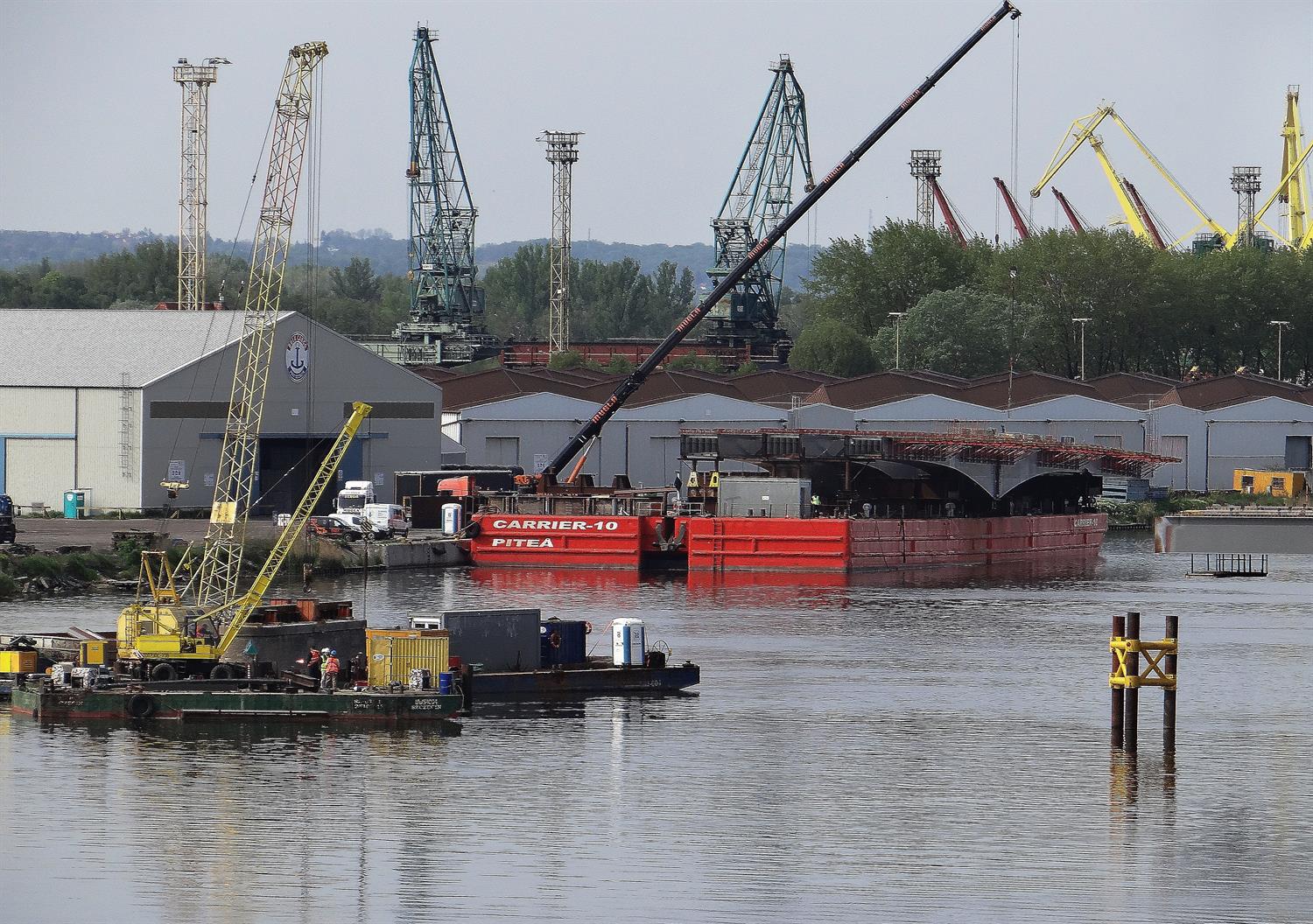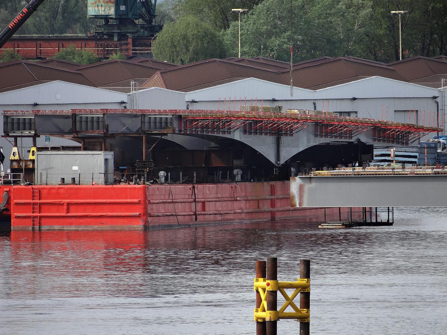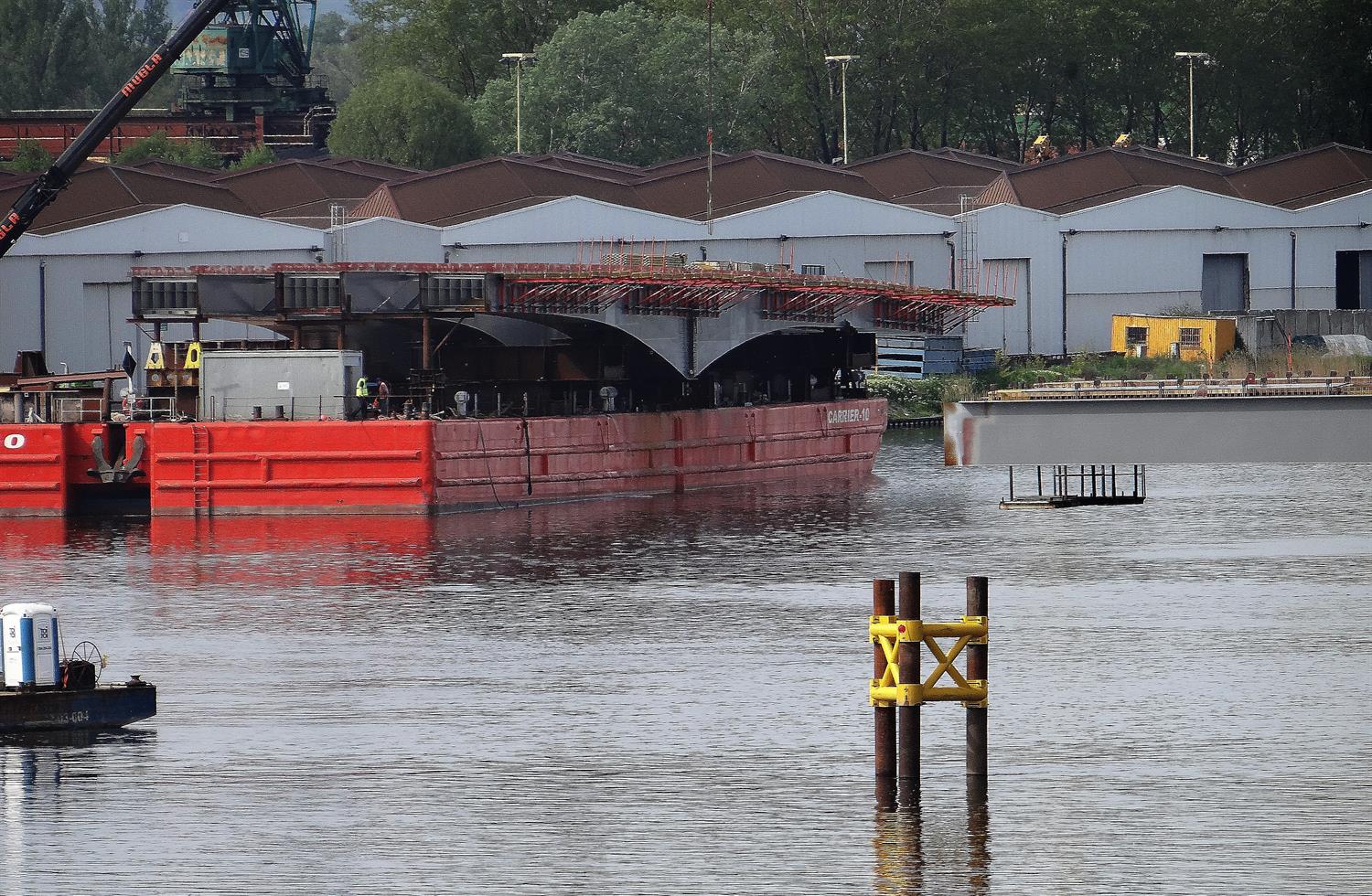 Pierwsze przęsło nowego mostu nad szczecińską Regalicą na filarze. To jego fragment od wschodniego przyczółka, czyli od Dąbia. Drugie czeka przy nabrzeżu po przeciwnej stronie rzeki na pontonie pływającym Carrier-10 na montaż. Każdy ze stalowych segmentów ma wymiary 14 m x 100 m.