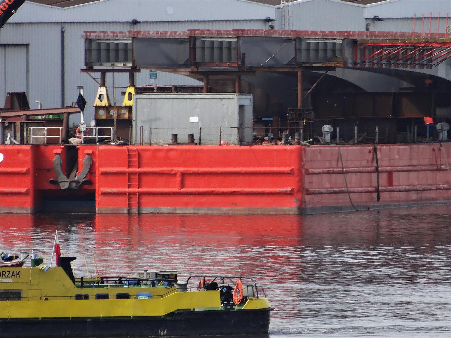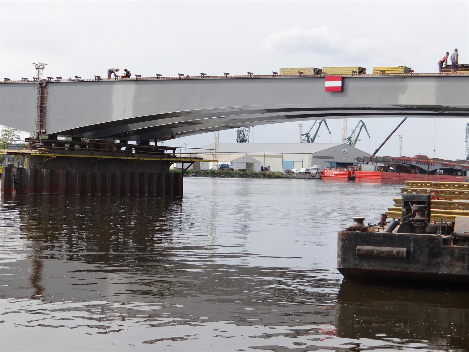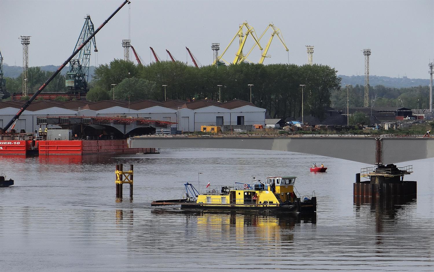 Pierwsze przęsło nowego mostu nad szczecińską Regalicą na filarze. To jego fragment od wschodniego przyczółka, czyli od Dąbia. Drugie czeka przy nabrzeżu po przeciwnej stronie rzeki na pontonie pływającym Carrier-10 na montaż. Każdy ze stalowych segmentów ma wymiary 14 m x 100 m.