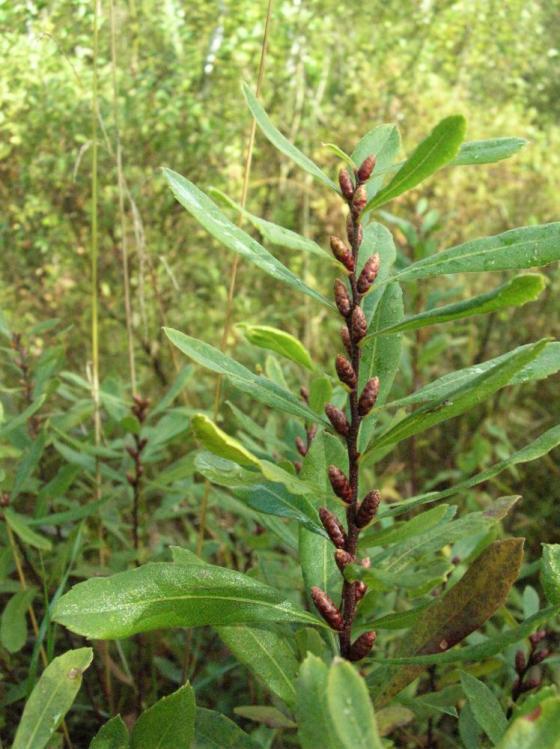 Woskownica ma niebieskozielone liście, pokryte charakterystycznymi włoskami, wydzielającymi silnie pachnące olejki. Pędy ma brązowe, a młodsze gałązki czerwonobrązowe wraz z pączkami pokryte licznymi drobnymi gruczołkami wydzielającymi bardzo drobne kropelki żywicy, złocistej barwy. Cała roślina wydziela przyjemny aromatyczny zapach, który utrzymuje się dość długo, również po jej zasuszeniu.