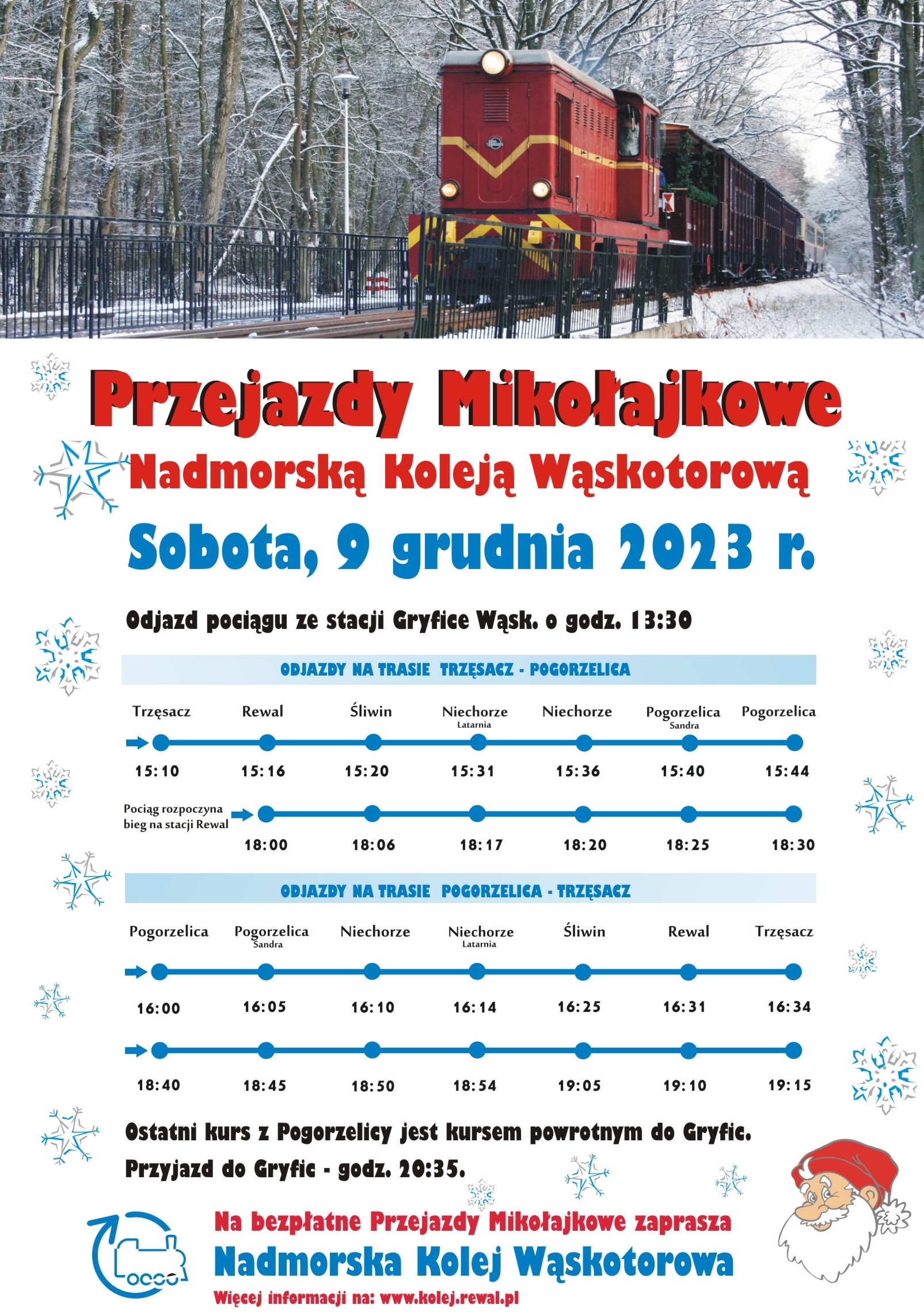 W sobotę, 9 grudnia 2023 r. na dworcu w Rewalu pojawi się Św. Mikołaj oraz jego pomocnicy. Na imprezę, organizowaną w ramach Konwoju Pomocników Św. Mikołaja będzie można dojechać Nadmorską Koleją Wąskotorową, która na tę okazję uruchamia bezpłatne kursy mikołajkowe.