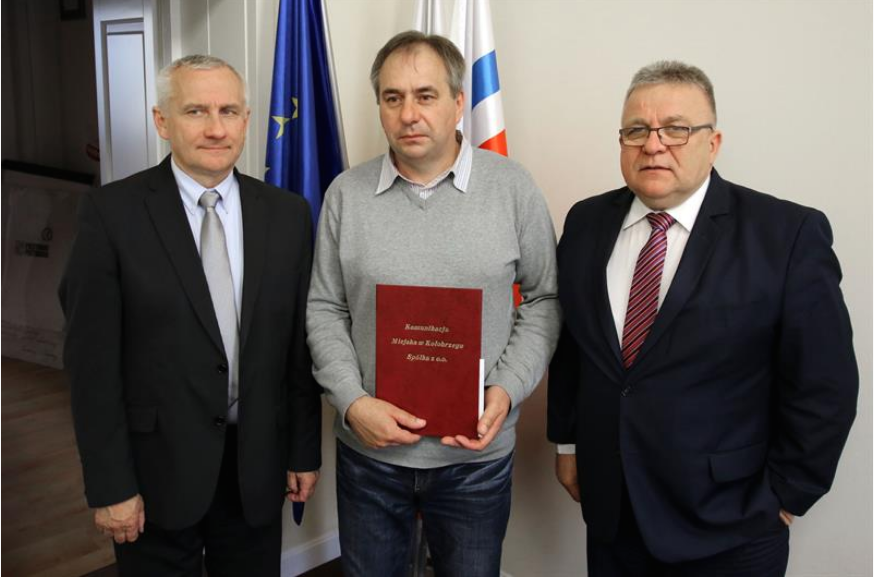 Na zdjęciu: Kierowca Roman Hekert nagrodzony przez prezydenta Kołobrzegu Janusza Gromka oraz prezesa Komunikacji Miejskiej Jana Warchoła.