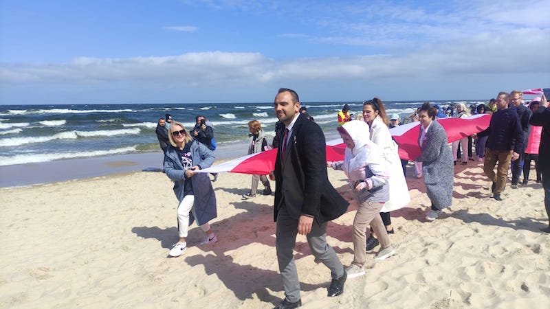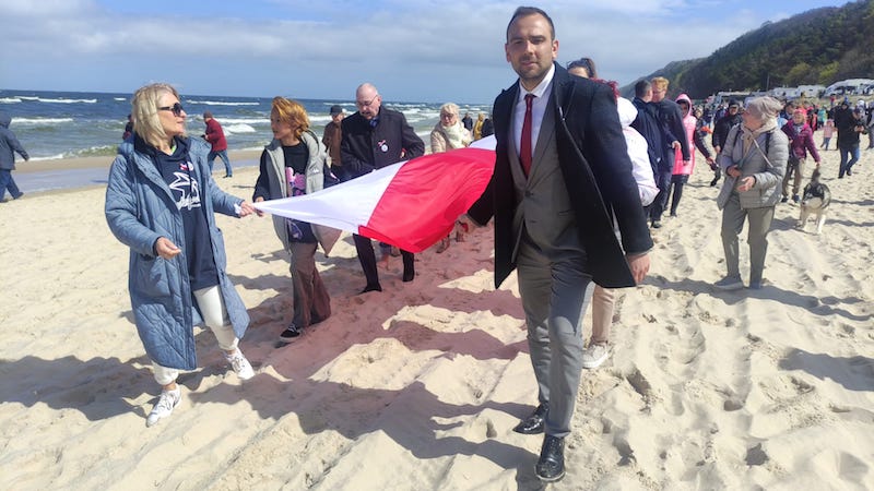 Radośni, uśmiechnięci ludzie cieszący się plażą pogodą i tym że mogą pokazać swoją flagę narodową razem ze wszystkimi także z lokalnych władz. Komu to przeszkadza że w Polsce ludzie się uśmiechają?