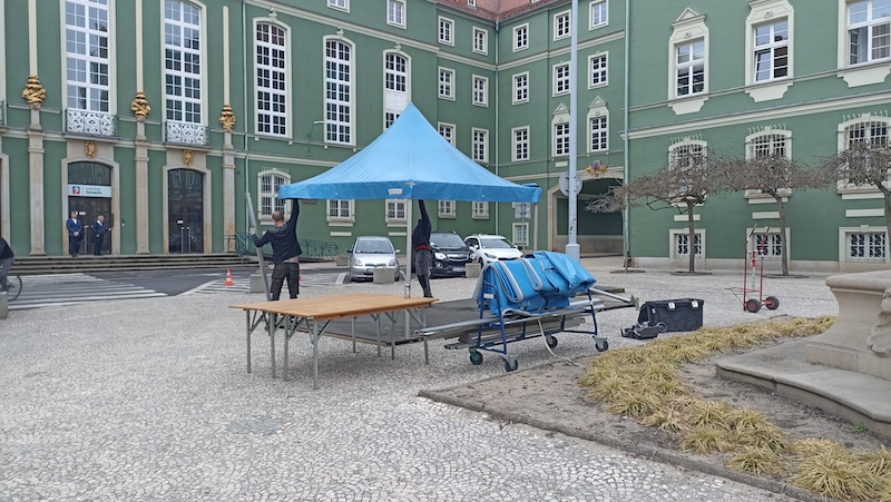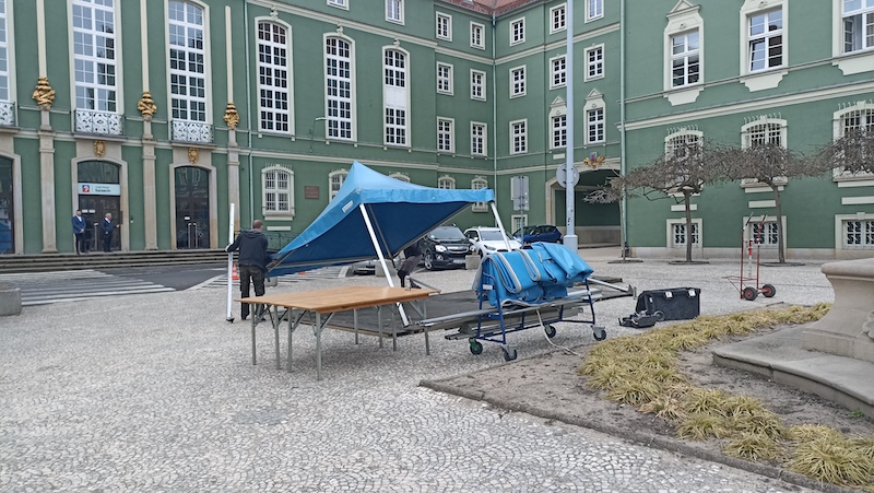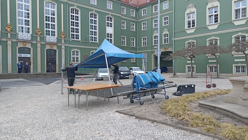 Sprzed szczecińskiego magistratu znikają niebieskie namioty, w których przez kilka tygodni uchodźcy z Ukrainy mogli pobierać, składać, a przy pomocy Miejskiego Centrum Świadczeń także wypełniać wnioski w sprawie uzyskania jednorazowej pomocy w wysokości 300 zł. Obecnie, wobec zmniejszenia się liczby potrzebujących, pomoc udzielana jest w środkowej części urzędu.