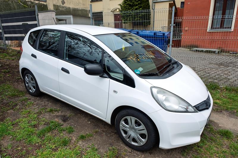 Na przedniej szybie białej Hondy pojawił się napis „TRAWNIK”.