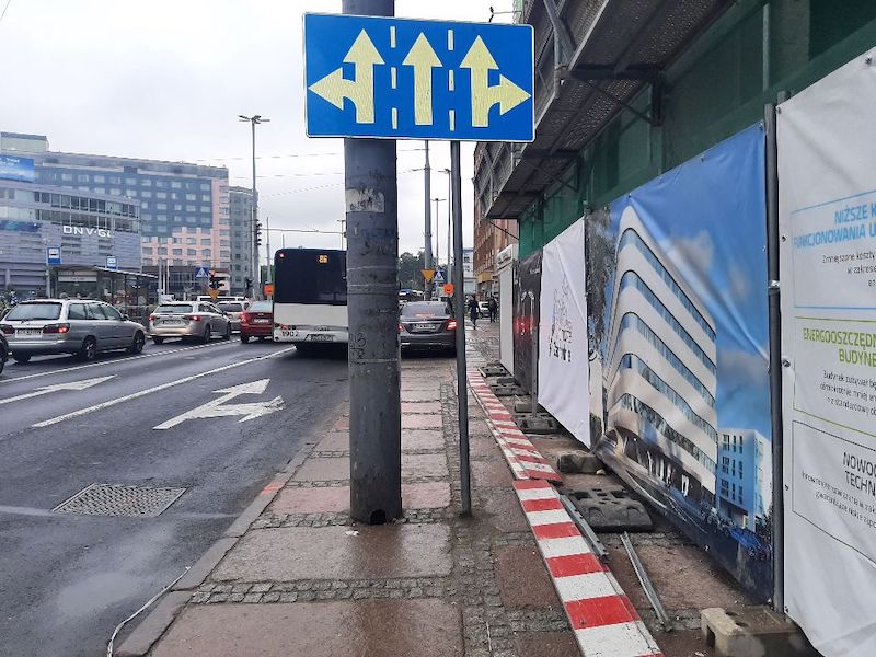 - Budowa nowej siedziby Urzędu Marszałkowskiego przy al. Piłsudskiego spowodowała, że chodnikiem w tej ruchliwej części miasta trudno się poruszać. Na dodatek na środku trotuaru zamontowano znak drogowy informujący o kierunkach jazdy na pasach drogowych. Pieszy jakoś się prześlizgnie, ale co ma zrobić rodzic pchający wózek z dzieckiem – pan Dariusz wysłał nam sygnał i zdjęcie za pośrednictwem NAPISZ DO NAS. – Co ma zrobić osoba poruszająca się na wózku inwalidzkim? Jak ten slalom ma pokonać schorowany starszy człowiek o lasce?