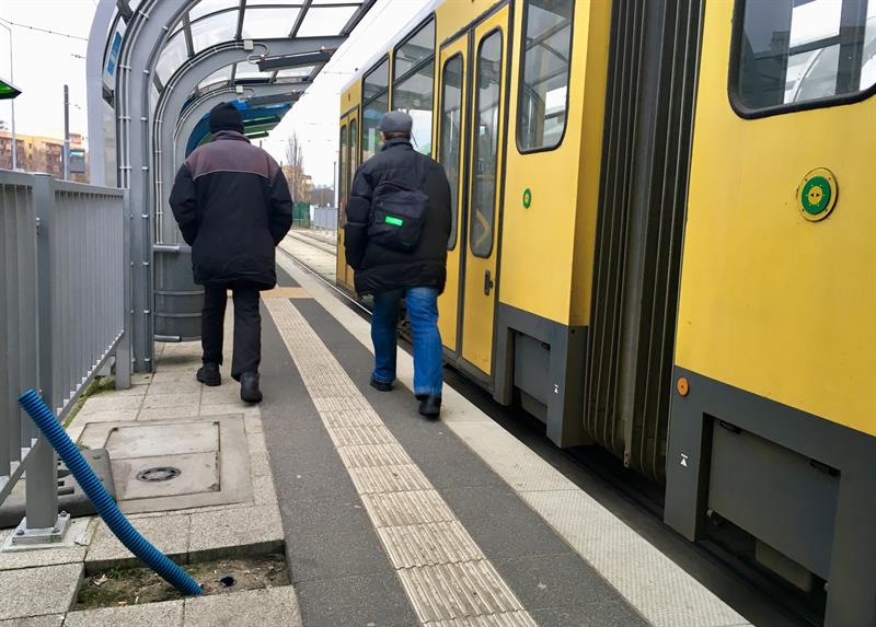 Odwiedziliśmy pętlę Turkusowa. W środowe popołudnie i ponownie w czwartek rano. Było tam bez zmian. Co więcej. Okazuje się, że oprócz wyrwy w peronie, który wyznaczony jest dla składów linii 2, na jeszcze większych rozmiarów identyczną pułapkę z wystającym z niej kawałkiem rury można natknąć się także na sąsiednim peronie dla tramwajów linii 7. A pasy obu tych peronów nie są na tyle szerokie, by przy stojącym czy nadjeżdżającym tramwaju mogły swobodnie wyminąć się dwie osoby wysiadające bądź wsiadające.