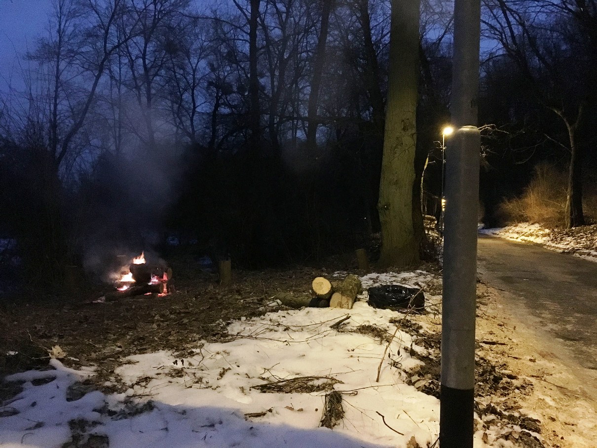 Napisał do nas Internauta Piotr zaniepokojony tym, co zobaczył przy szczecińskich Syrenich Stawach: "Niedaleko kąpieliska Arkonka trwają prace przy wycinaniu drzew i krzewów. Nie byłoby w tym nic dziwnego, gdyby nie sposób robotników na ogrzanie się. Otóż panowie rozpalają ognisko, a po skończonej pracy "zapominają" je zagasić. Ogień pozostaje bez nadzoru do samego rana. Wystarczy większy podmuch wiatru albo grupa chuliganów i nieszczęście gotowe. Pomijam już fakt, że w lasach i parkach ognisko wolno rozpalać tylko w miejscach do tego przeznaczonych. Polecam teren uwadze służb mundurowych. Może straż miejska w końcu na coś się przyda?".