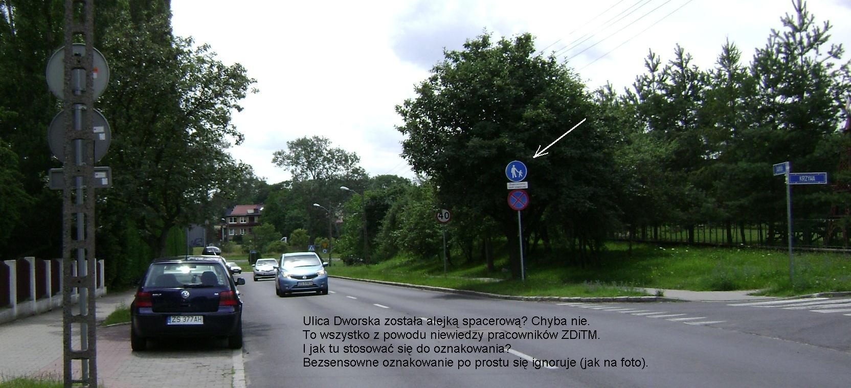 Napisał do nas Internauta Marek, zwracając uwagę na znaki drogowe przy ul. Dworskiej w Szczecinie: „Znaki drogowe ustawiono bez sensu i znajomości przepisów. Znaki ustawia się z prawej strony drogi (drogi rowerowej, chodnika, ciągu spacerowego). Wskazany znak należy przenieść na prawy skraj chodnika, bo znak ten chodnika dotyczy TYLKO, nieprawdaż?”. Jak stwierdza przy ul. Dworskiej wiele znaków wymaga przeniesienia.