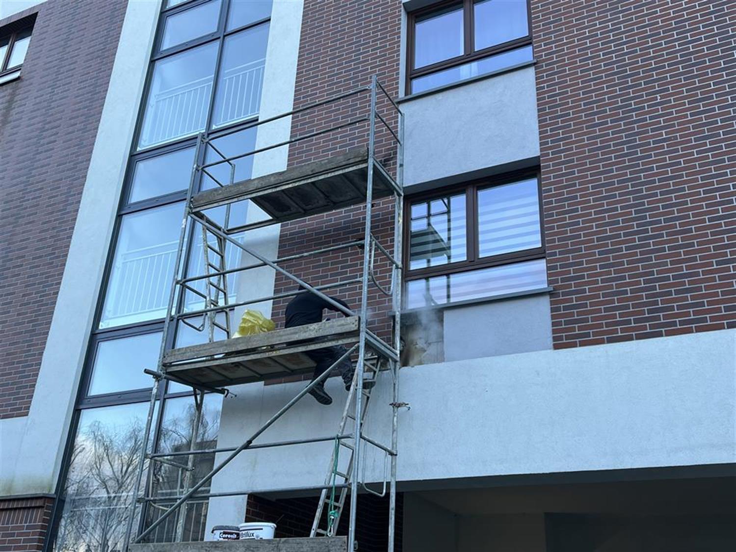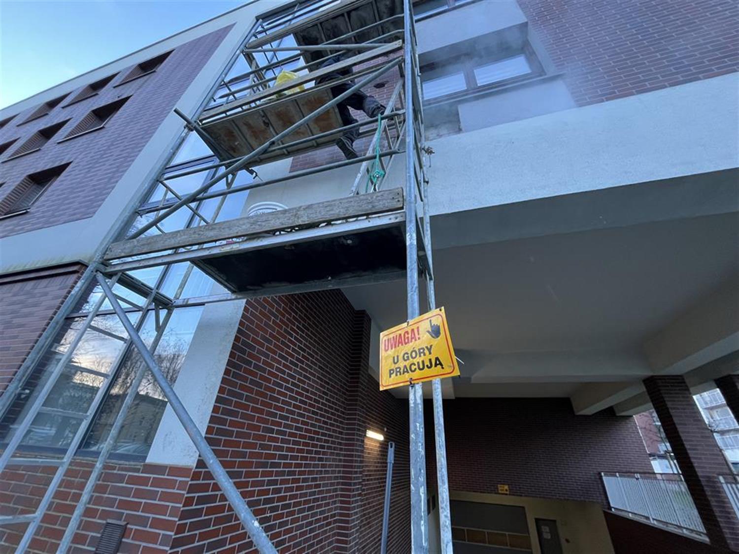 Służby techniczne administratora budynku rozpoczęły teraz naprawę skutków nierozważnej sylwestrowej zabawy. Przy bloku ustawione zostało rusztowanie, z którego wymieniana jest wypalona izolacja i zewnętrzna okładzina elewacji.