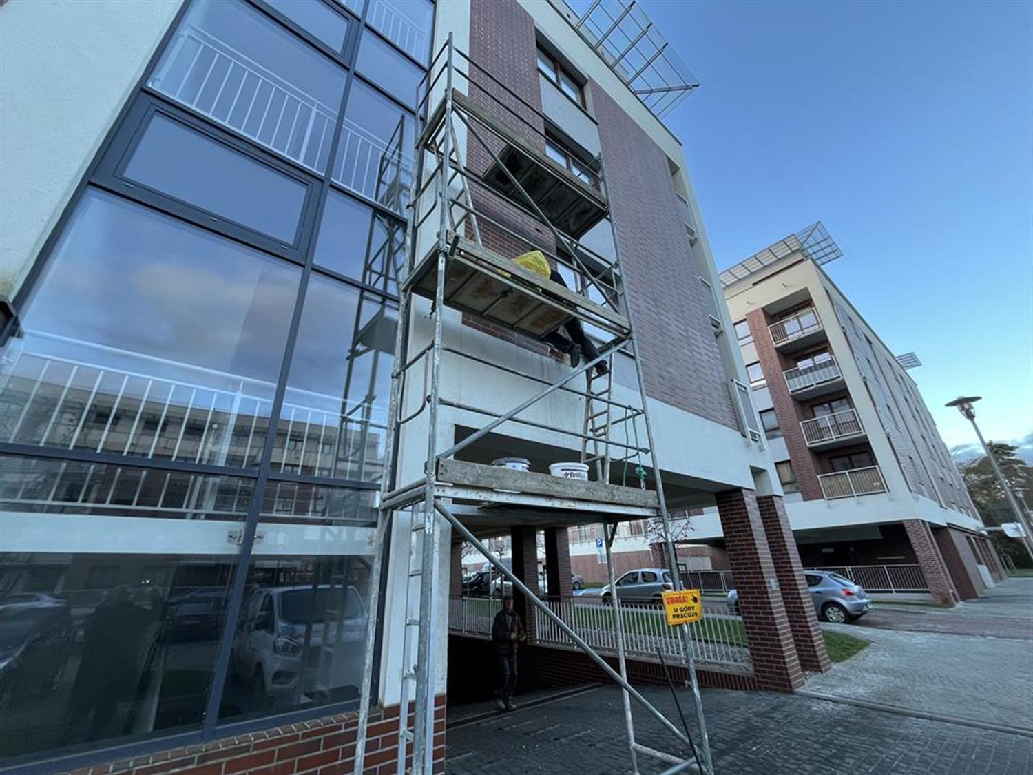 Trwa naprawa zniszczonej przez fajerwerki elewacji nowego bloku w Szczecinie. Fot. Piotr Sikora
