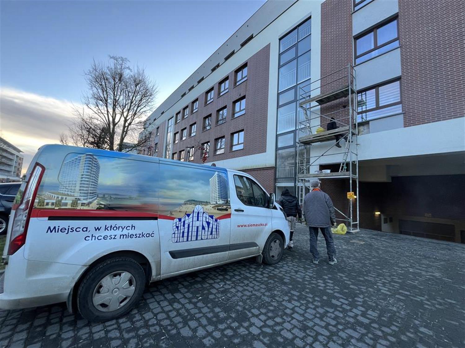 Naprawiają wypaloną przez fajerwerki elewację nowego bloku w Szczecinie