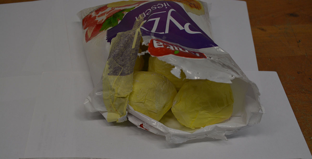 Policjanci z wydziału kryminalnego z wałeckiej jednostki pełniąc służbę na terenie miasta, przed jednym z osiedlowych bloków zauważyli jak młody mężczyzna, widząc idących w jego kierunku funkcjonariuszy, odrzuca foliowe opakowanie do skrzynki na reklamy. Kiedy podeszli bliżej, zauważyli w skrzynce, między gazetami opakowanie z pyzami mięsnymi. Jak się okazało, zamiast klusek, w opakowaniu foliowym znajdowały się narkotyki.