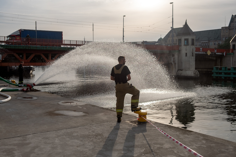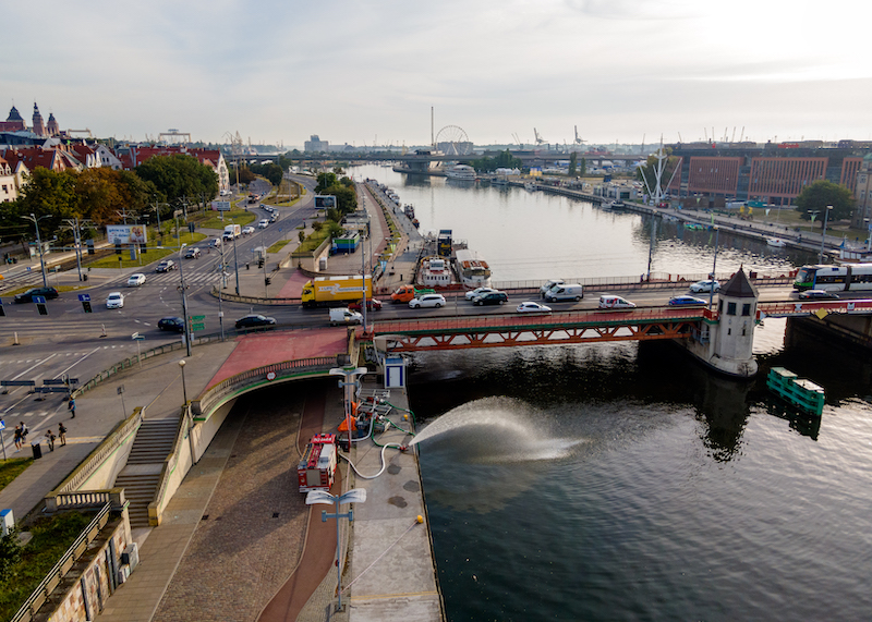 – Obecnie pracuje 25 pomp w sześciu lokalizacjach: w Gryfinie (4 małe i 1 duża OSP), Moczyłach (1 duża ZUW), w Siadle Dolnym (1 duża PSP, 1 duża ZUW i 3 małe PSP), w Szczecinie na Dziewokliczu (1 duża ZUW i 1 PZW), przy moście Długim (2 duże ZUW), przy ul. Perkuna (1 duża ZUW, 3 średnie PSP, 6 małych PSP) – wymienił M. Ruczyński. – W odwodzie pozostaje sześć dużych pomp PSP i dwie duże ZUW, które będą dziś instalowane w kolejnych miejscach.