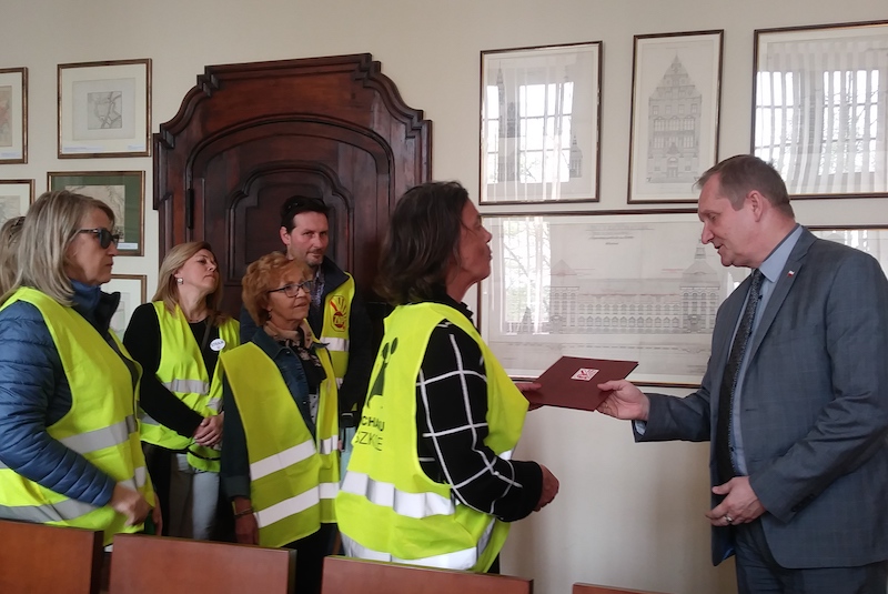Maria Świerczek, prezes szczecińskiego oddziału ZNP przekazuje pismo Pawłowi Rodzosiowi, dyrektorowi Wydziału Bezpieczeństwa i Zarządzania Kryzysowego ZUW. Fot. Elzbieta Kubera