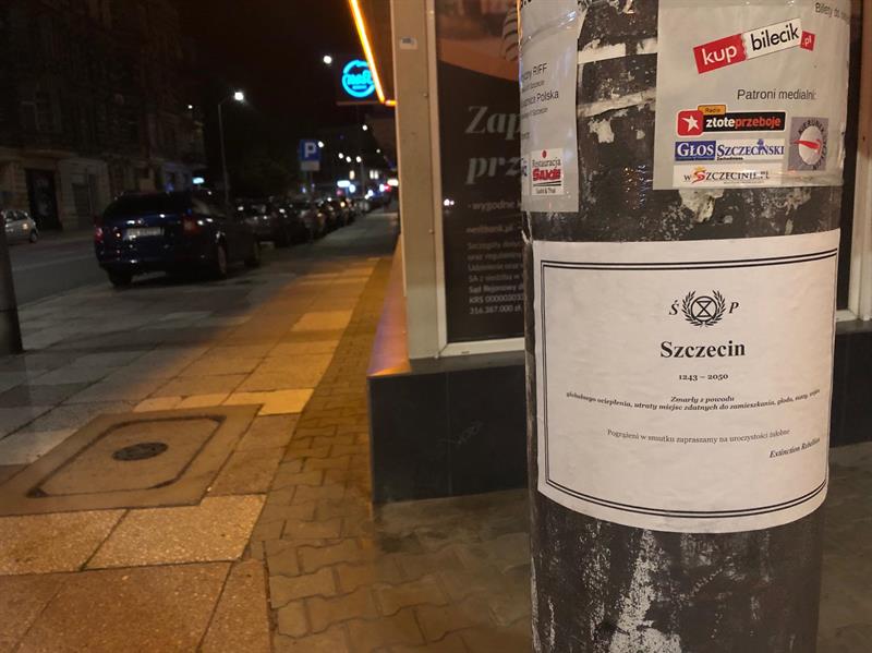 Nekrologi ogłaszające wymarcie ludzkości z datą 2050 roku pojawiły się ostatnio w kilku miejscach Szczecina. To część działań grupy Extinction Rebellion Szczecin (nazwa czasem skracana do XR Szczecin), która próbuje niekonwencjonalnymi metodami uświadamiać ludzi o konieczności rozwiązania kryzysu klimatycznego oraz zmuszać polityków do podjęcia działań.