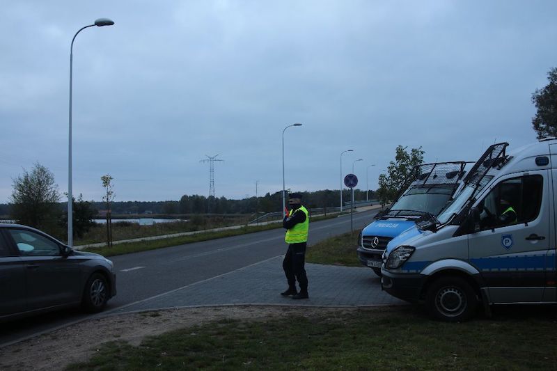 Na zdjęciu: policjanci pilnujący wjazdu na most łączący wyspę Wolin z wyspą Karsibór.