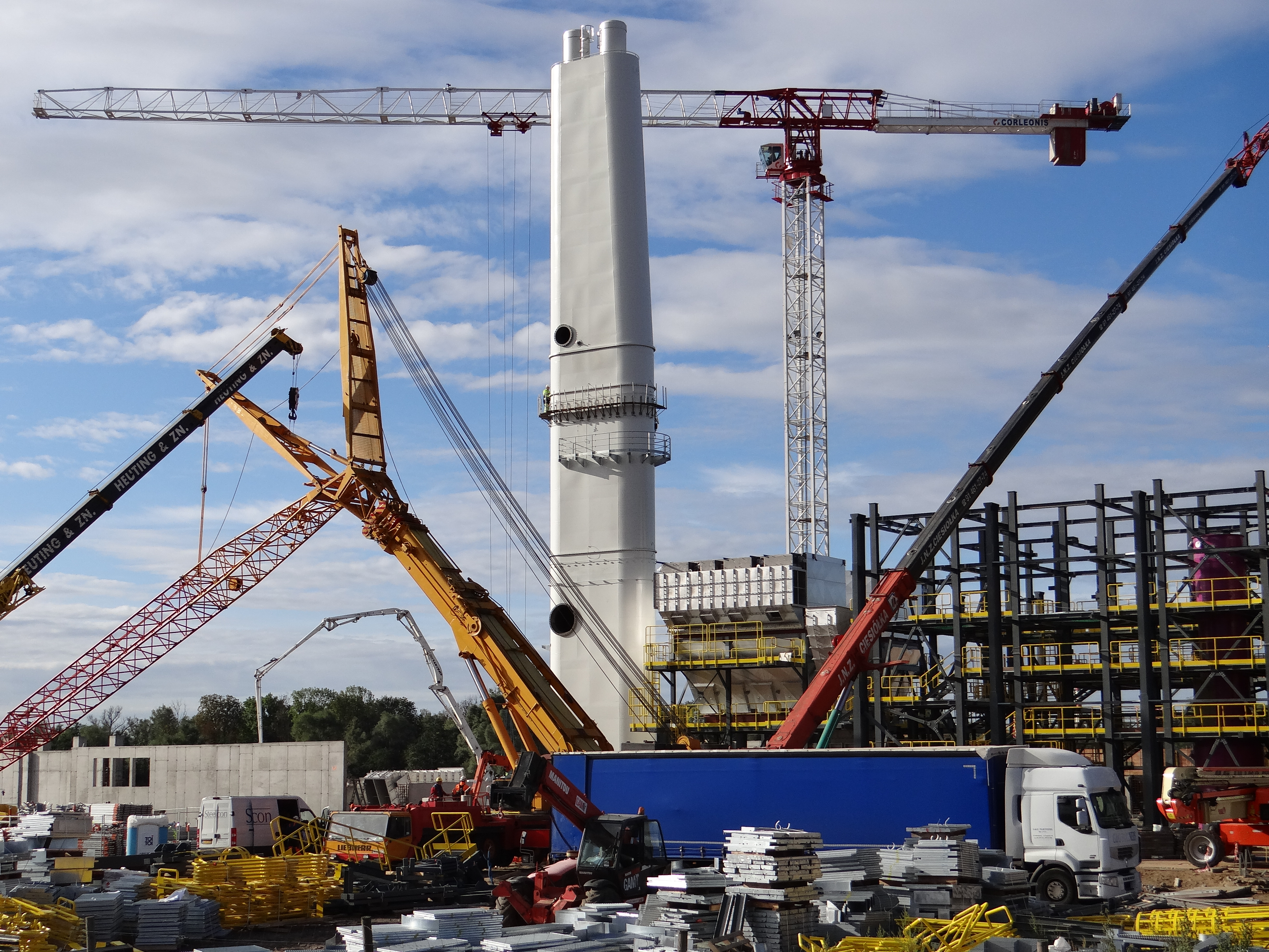 Mowa o kominie przy instalacji oczyszczania spalin, obok wznoszonej konstrukcji hali z ustawionymi już w jej wnętrzu kotłami, kondensatorami, turbiną generatora i rusztami. Kształtem przypomina olbrzymi komin statku.