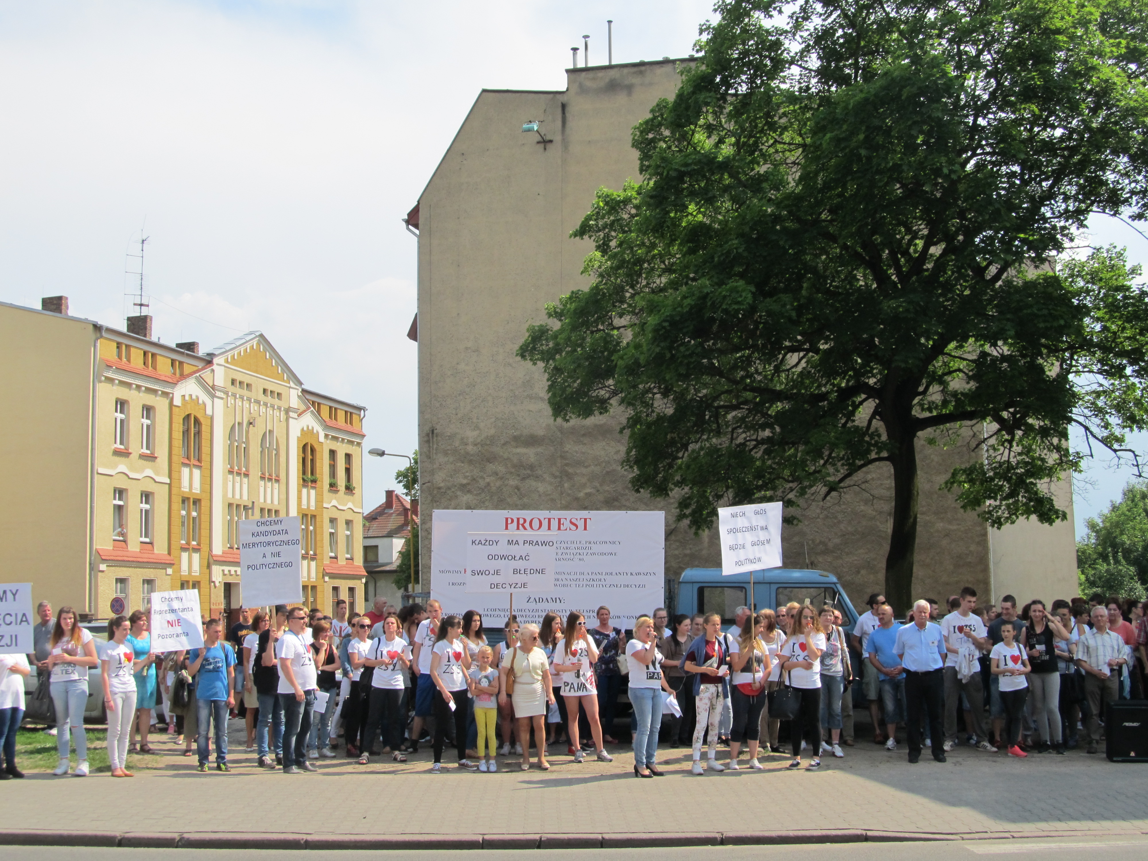 Zebrani we wtorek naprzeciwko budynku starostwa protestujący wyrażali swoje niezadowolenie gwizdami, okrzykami i dźwiękiem trąbek, a w rękach trzymali transparenty z napisami: „Niech głos społeczeństwa będzie głosem polityków", „Chcemy kandydata merytorycznego, a nie politycznego", „Chcemy reprezentanta, a nie pozoranta!" oraz „Żądamy konkursu sprawiedliwego, a nie politycznego!".