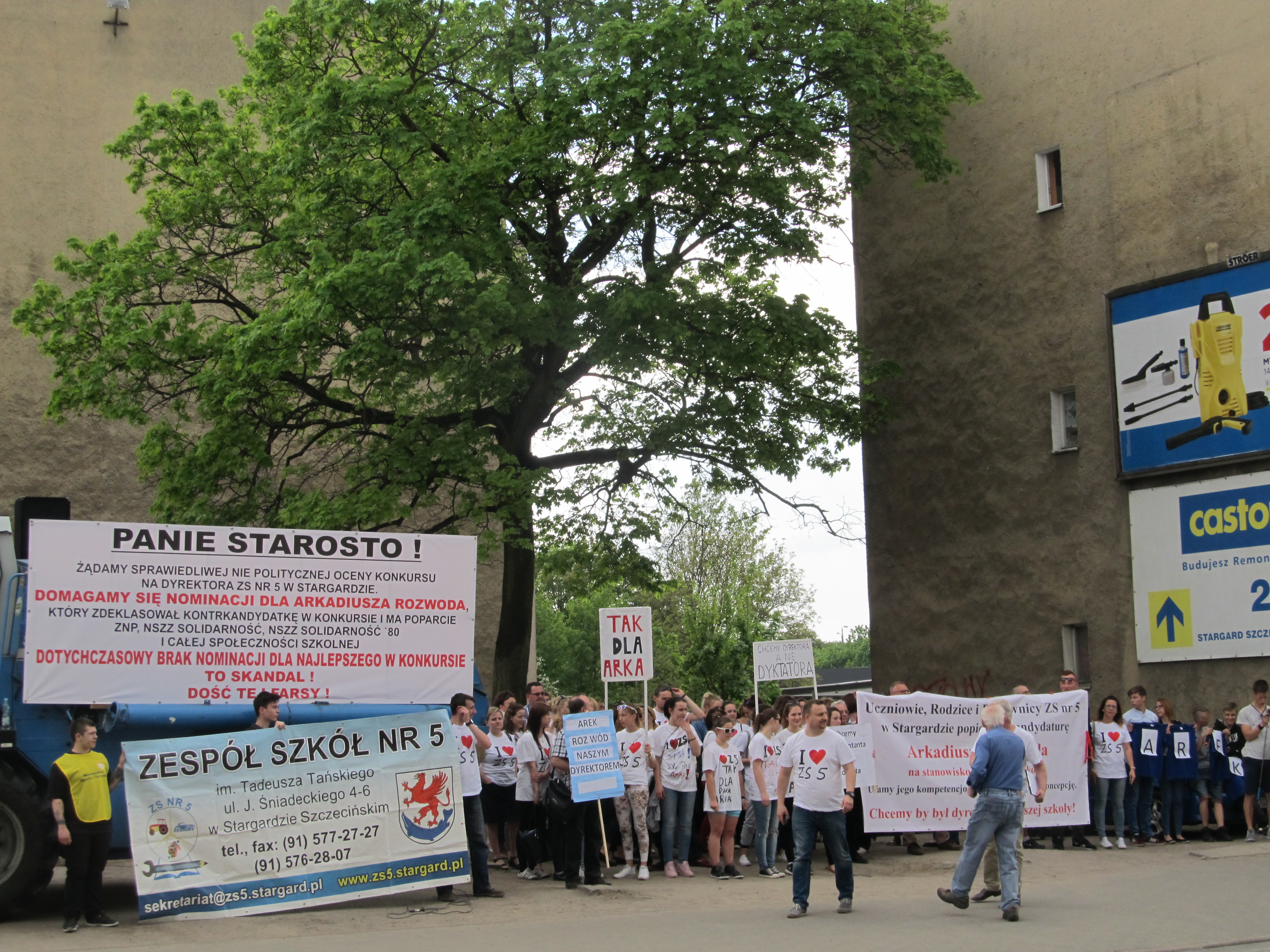 Uczniowie, nauczyciele, pracownicy administracji oraz przedstawiciele rady rodziców i szkolnych związków zawodowych ZS nr 5 zorganizowali pikietę przed budynkiem starostwa, dając w ten sposób wyraz poparcia dla Arkadiusza Rozwoda. „Przebrała się miarka, chcemy Arka!”, „Chcemy dyrektora, a nie dyktatora!”, „Chcemy reprezentanta, a nie pozoranta!”, „Arek na dyrektora!” – skandowali przed siedzibą starosty. ©℗