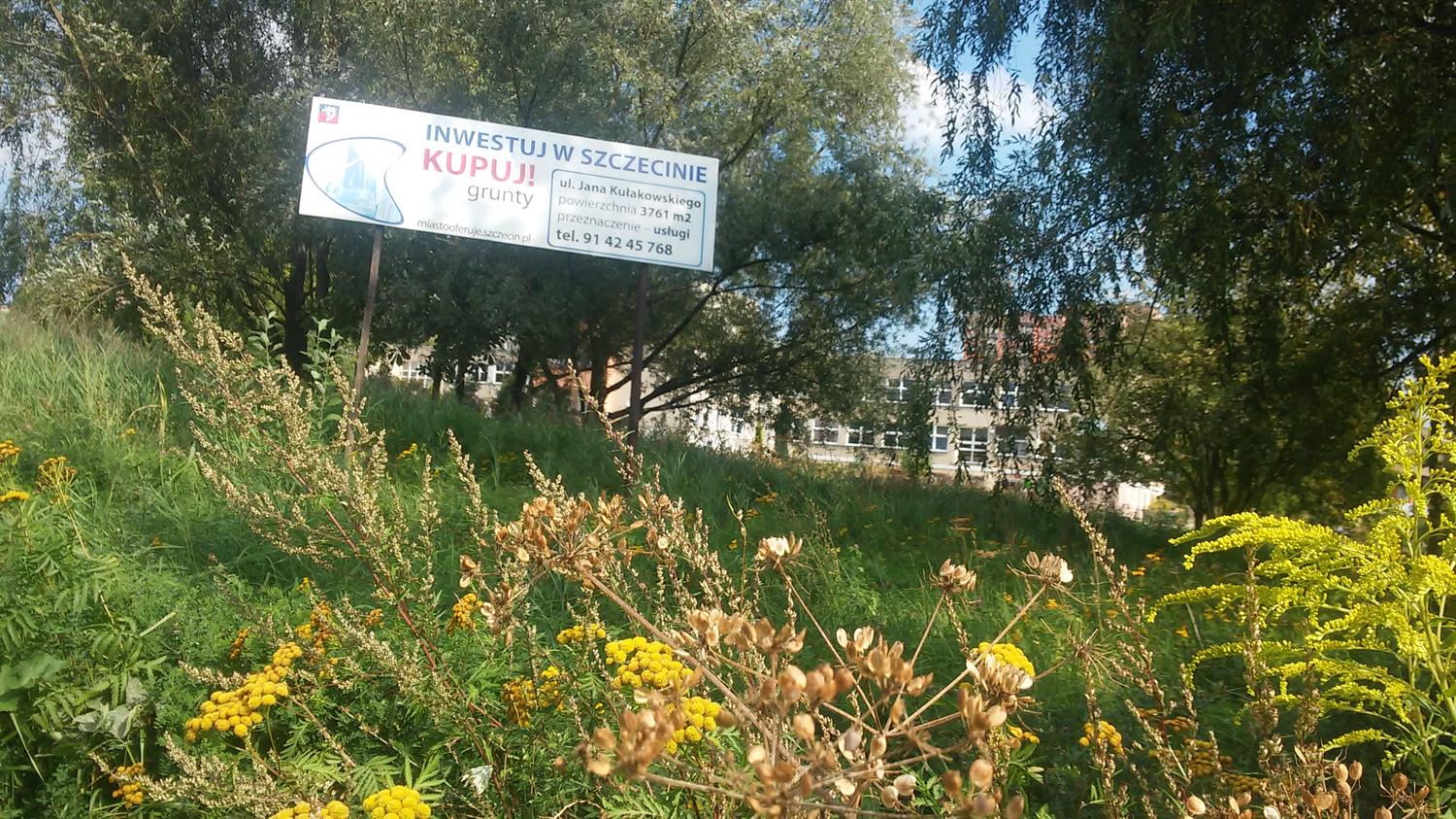 Rzeczywiście oba trawniki dawno nie były koszone. Jeden przylega do Wspólnoty Mieszkaniowej Warcisława 8-8E, na drugim stoi tablica z hasłem "Inwestuj w Szczecinie. Kupuj grunty!". A więc przynajmniej ten trawnik należy do miasta.