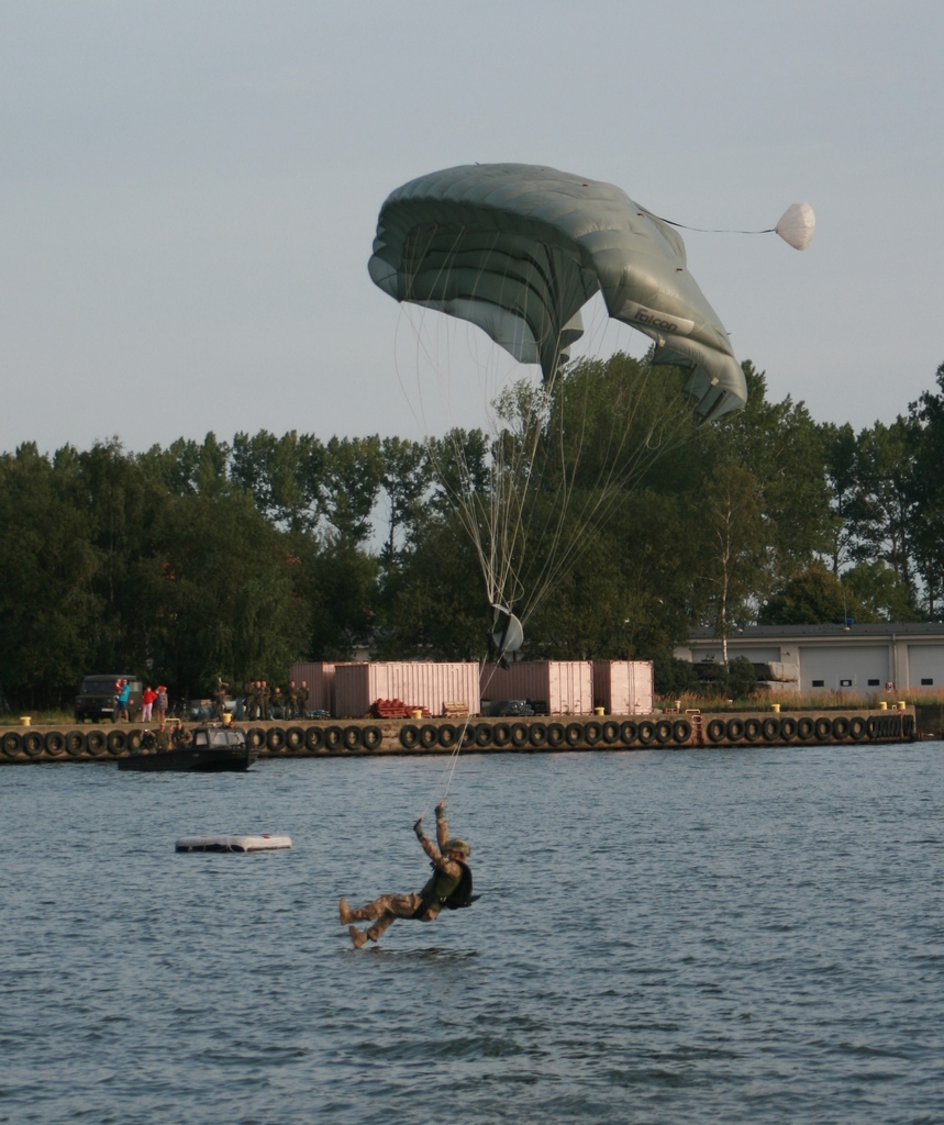 Kulminacyjnym punktem festynu, który zgromadził tłumy wczasowiczów nad rzeką Dziwną, był pokaz skoków spadochronowych do rzeki. 9 skoczków skakało z helikoptera z wysokości 1200 metrów. Pierwsza trójka wylądowała daleko od celu. Z drugiej trójki tylko jeden wylądował koło celu na wysokości stacji benzynowej. Ostatnią trójkę skoczków wiatr zepchnął w stronę mostu zwodzonego, gdzie na pomoc pośpieszyli im koledzy motorówkami asekurującymi pokazy. No cóż, nawet najlepszym nie wszystko wychodzi...