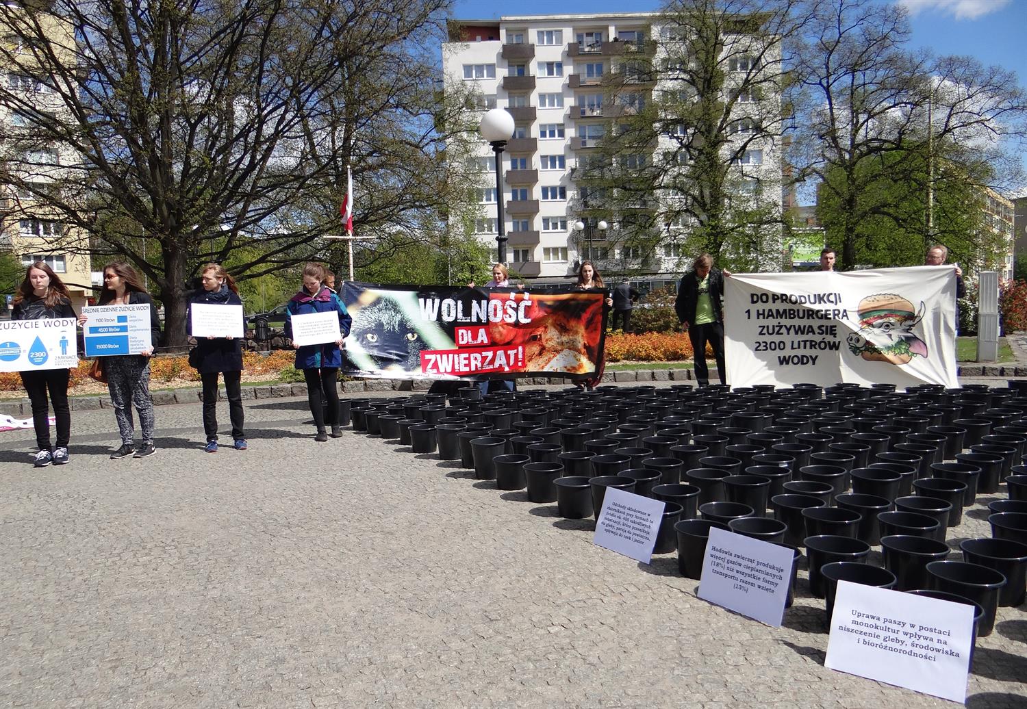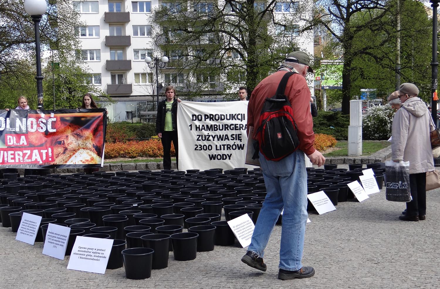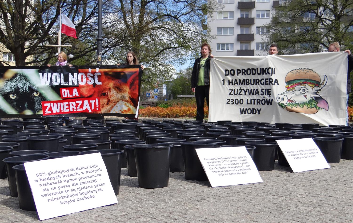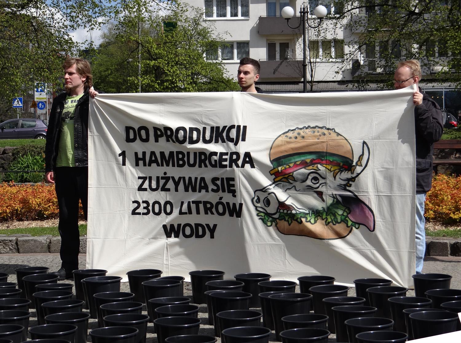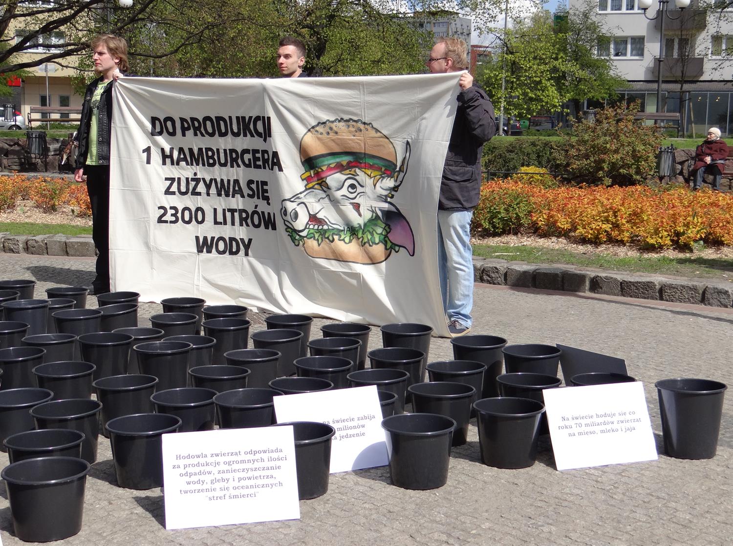 Na sztandarze hasło: „Wolność dla zwierząt". Obok 300 czarnych wiader. Mają uzmysłowić przechodniom, jak wygląda ledwie ułamek z ponad 2,3 tysięcy litrów wody, niezbędnych do zamknięcia całego procesu produkcji z jednym finalnym produktem - pozbawionym smaku i ociekającym tłuszczem hamburgerem.