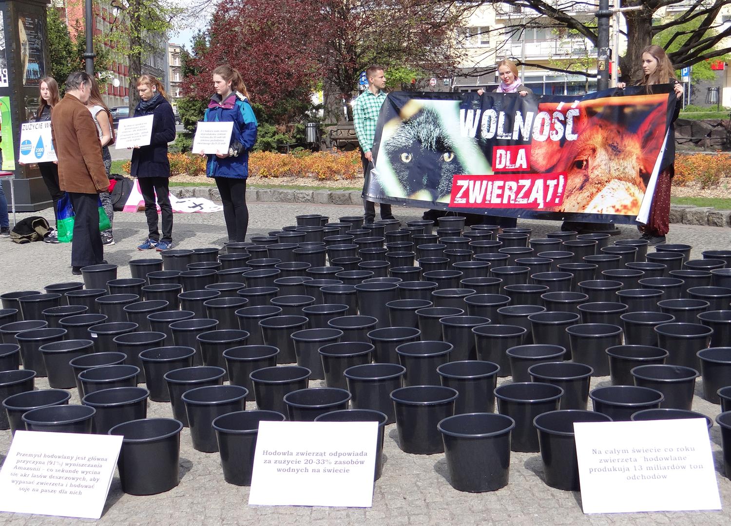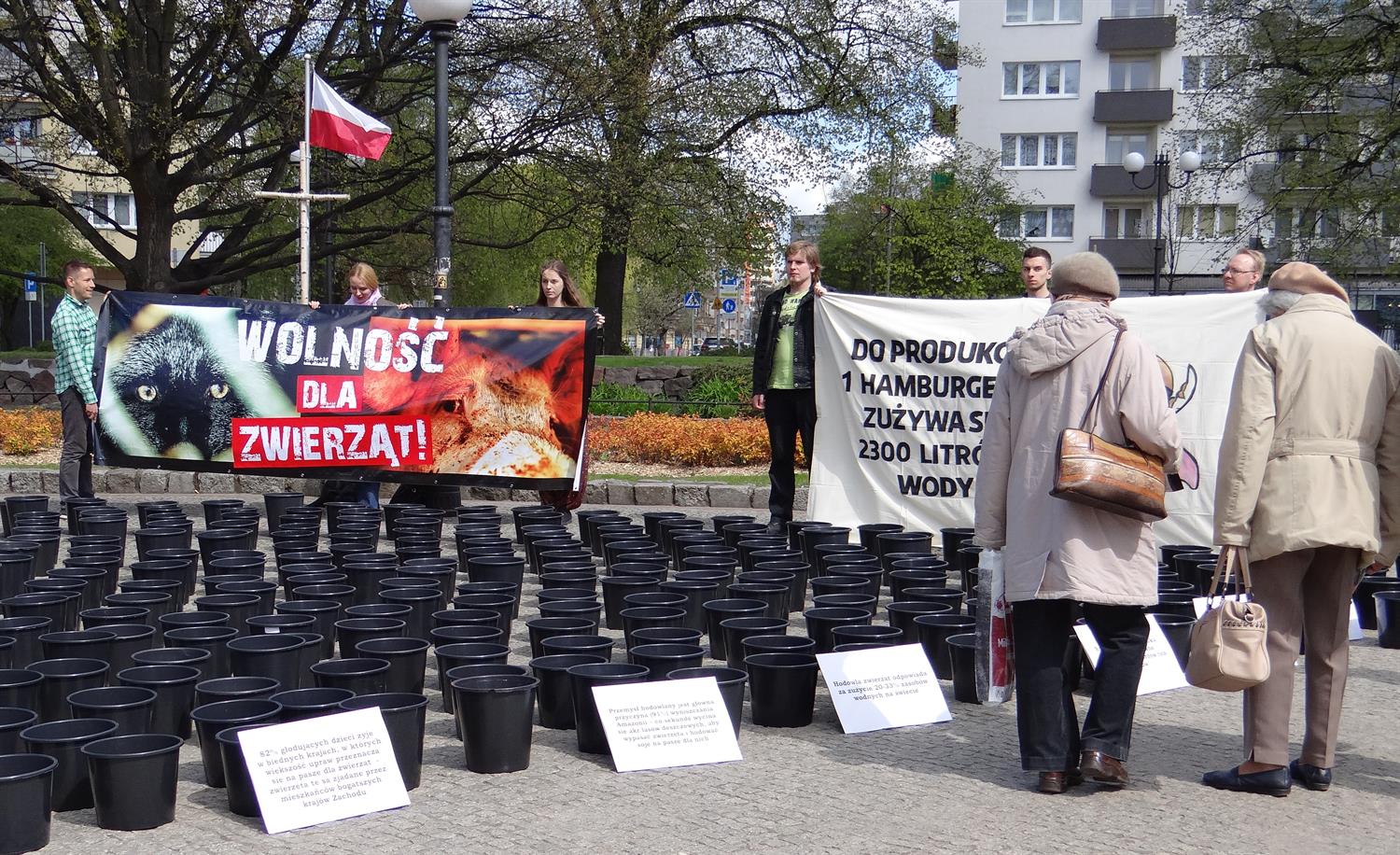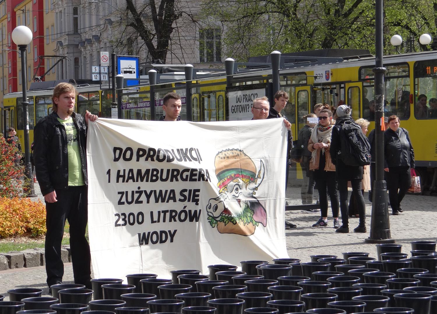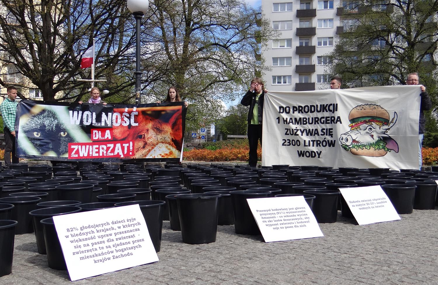 Na sztandarze hasło: „Wolność dla zwierząt". Obok 300 czarnych wiader. Mają uzmysłowić przechodniom, jak wygląda ledwie ułamek z ponad 2,3 tysięcy litrów wody, niezbędnych do zamknięcia całego procesu produkcji z jednym finalnym produktem - pozbawionym smaku i ociekającym tłuszczem hamburgerem.