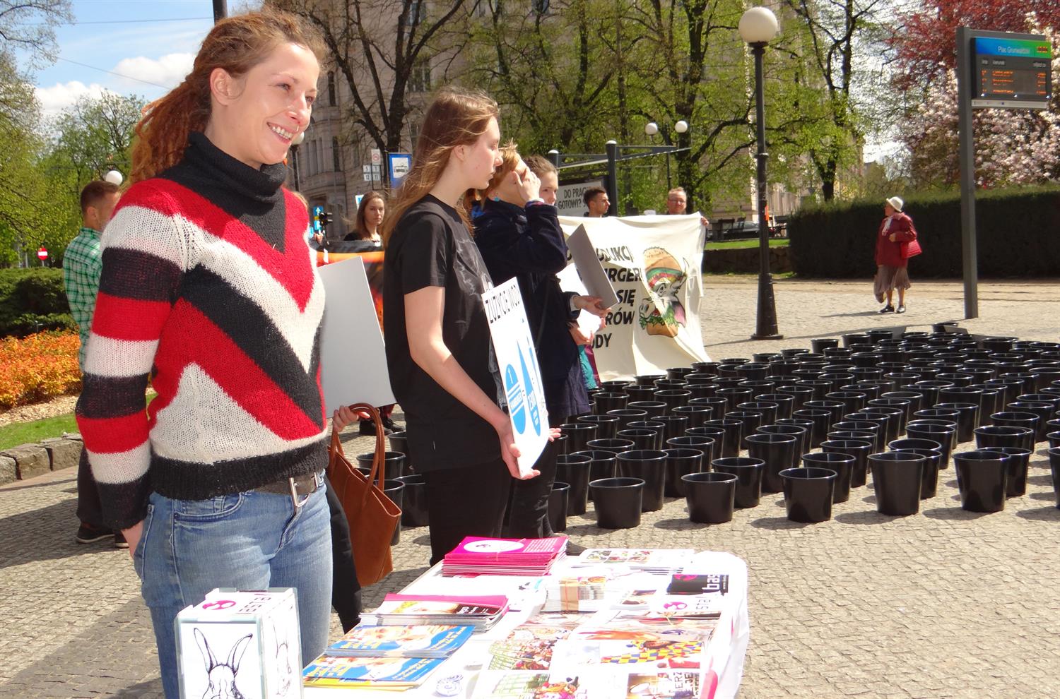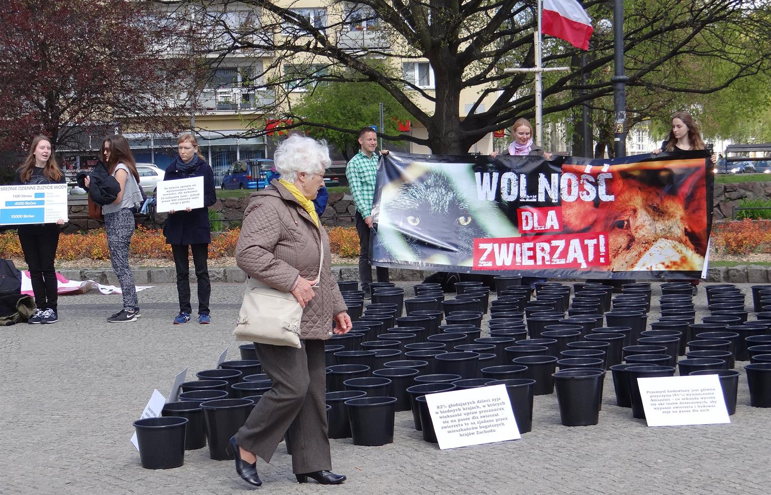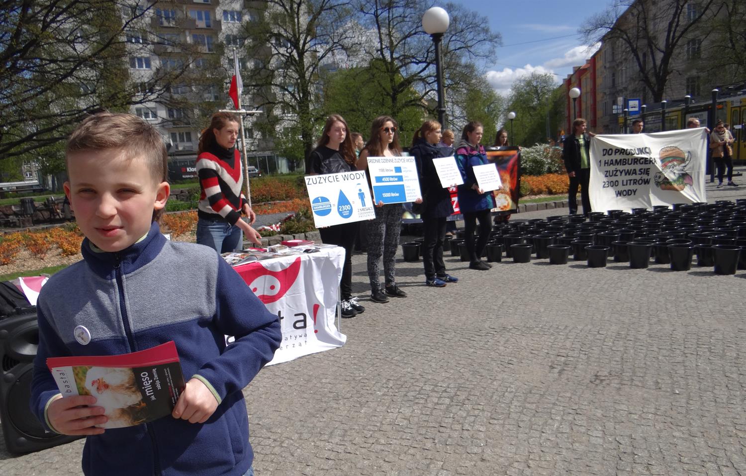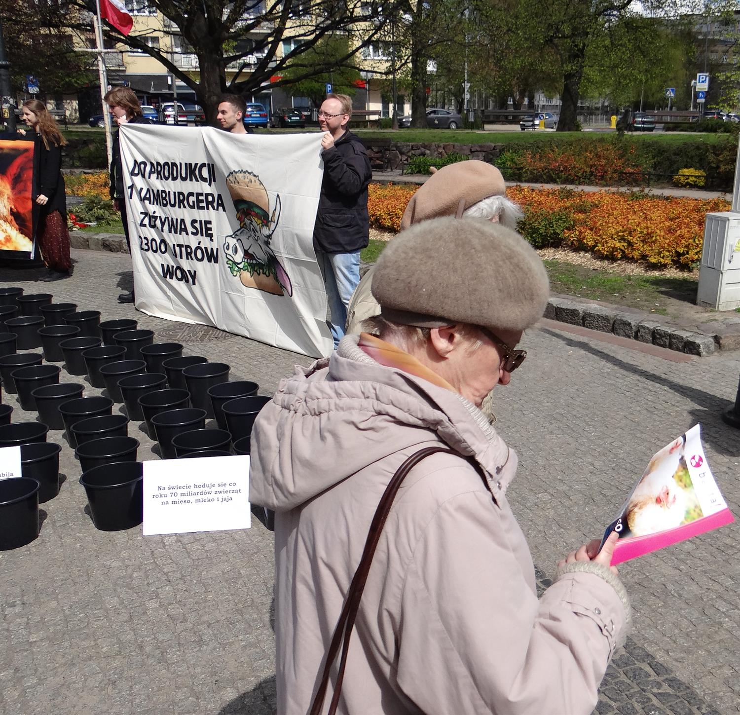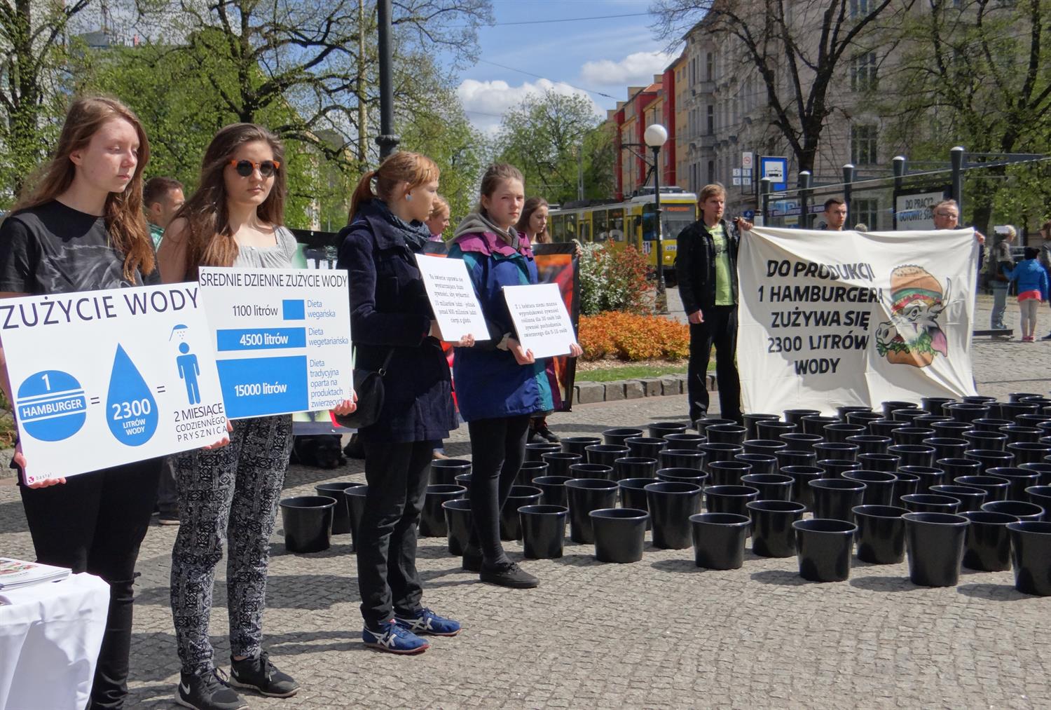 Na sztandarze hasło: „Wolność dla zwierząt". Obok 300 czarnych wiader. Mają uzmysłowić przechodniom, jak wygląda ledwie ułamek z ponad 2,3 tysięcy litrów wody, niezbędnych do zamknięcia całego procesu produkcji z jednym finalnym produktem - pozbawionym smaku i ociekającym tłuszczem hamburgerem.