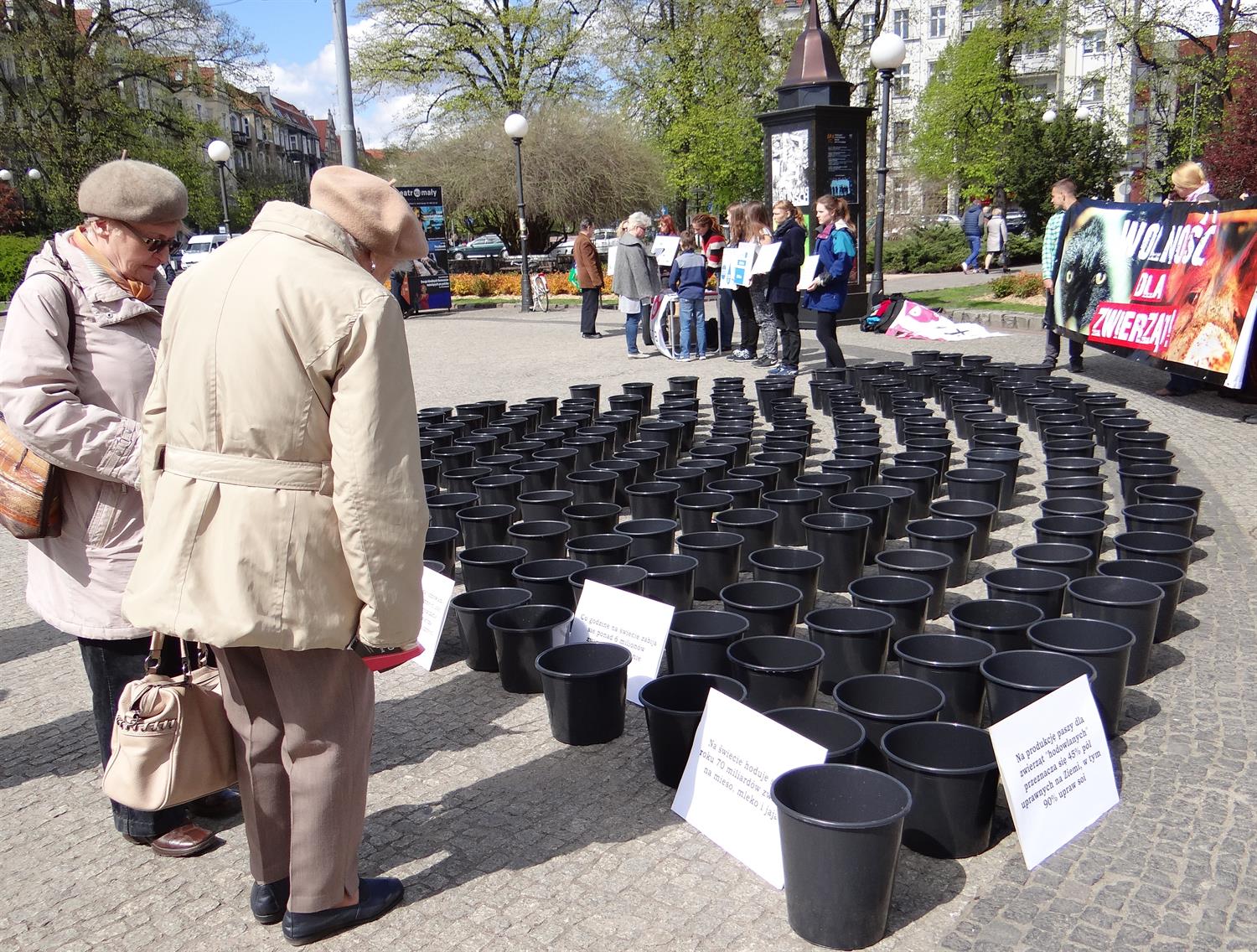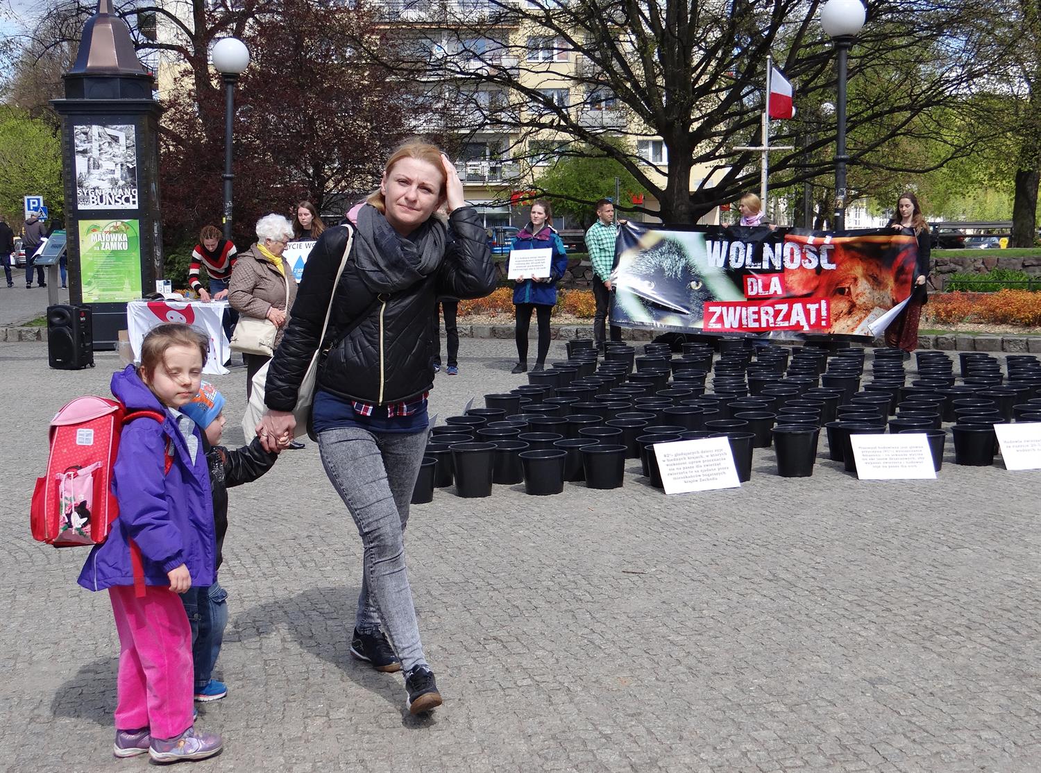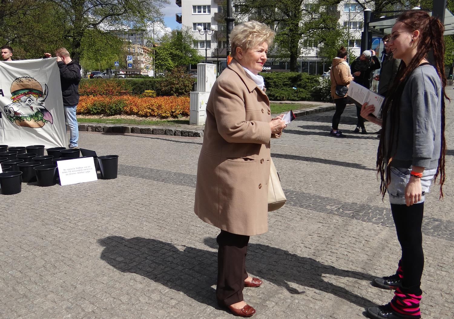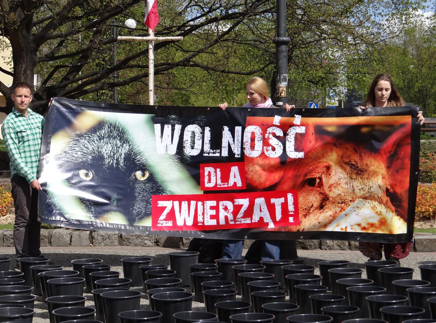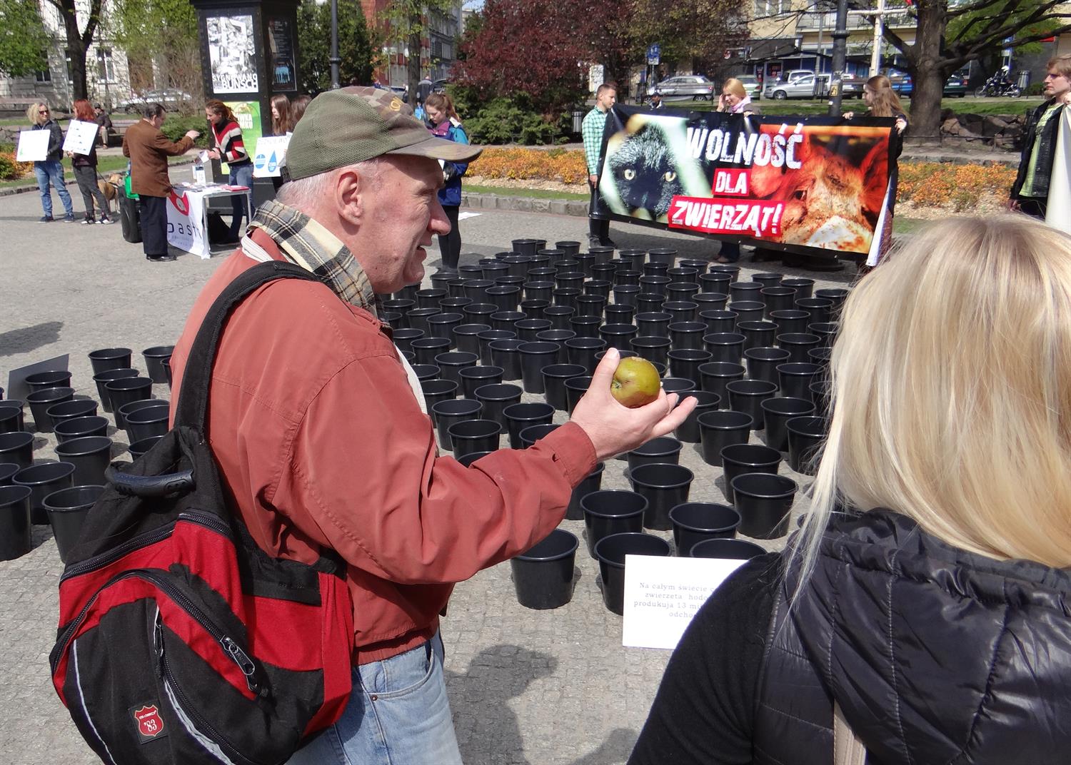 Na sztandarze hasło: „Wolność dla zwierząt". Obok 300 czarnych wiader. Mają uzmysłowić przechodniom, jak wygląda ledwie ułamek z ponad 2,3 tysięcy litrów wody, niezbędnych do zamknięcia całego procesu produkcji z jednym finalnym produktem - pozbawionym smaku i ociekającym tłuszczem hamburgerem.