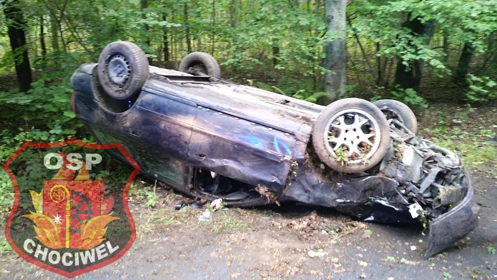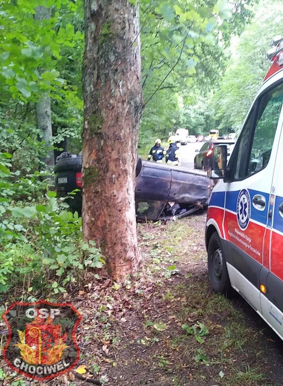 Na zdjęciach udostępnionych w mediach społecznościowych przez OSP Chociwel widać rozbite auto, które dachowało. W wyniku zdarzenia poszkodowana została jedna osoba.